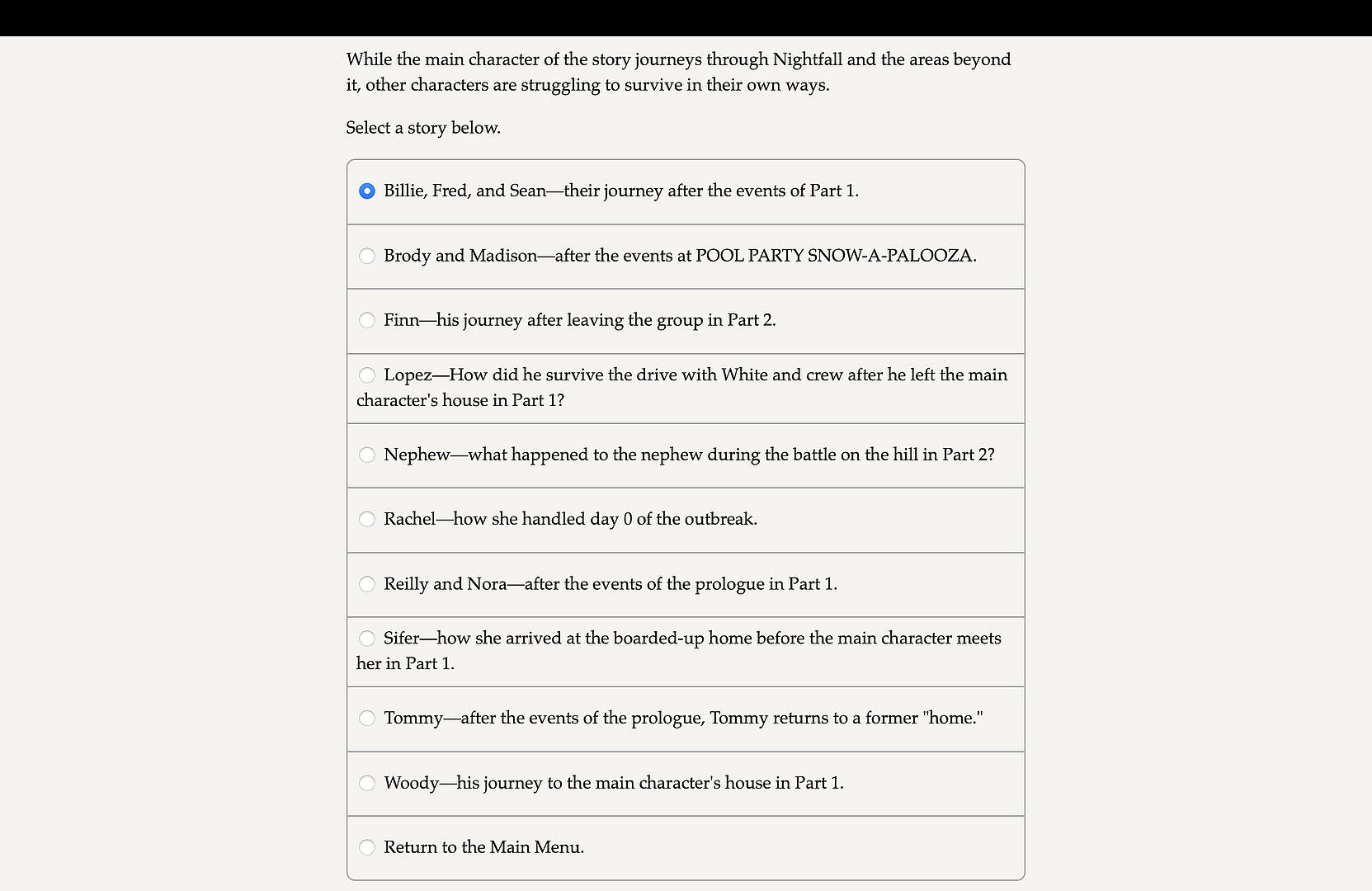 Discover stories from the zombie apocalypse outbreak through 26,000 words of non-interactive content. Follow Billie, Fred, and Sean as they team up right after chaos erupts. See how Brody and Madison endure a massive snowstorm, and track Rachel's actions on day zero. This indie RPG adventure reveals survival tales of Reilly, Nora, Finn, Woody, Tommy, Lopez, Sifer, a nephew with his pet Wolfhound during the Battle on the Hill, and more. Players unlock these fixed narratives set amid apocalyptic events. Fans of story-driven RPGs and adventure tales in zombie outbreaks find focused reading here.