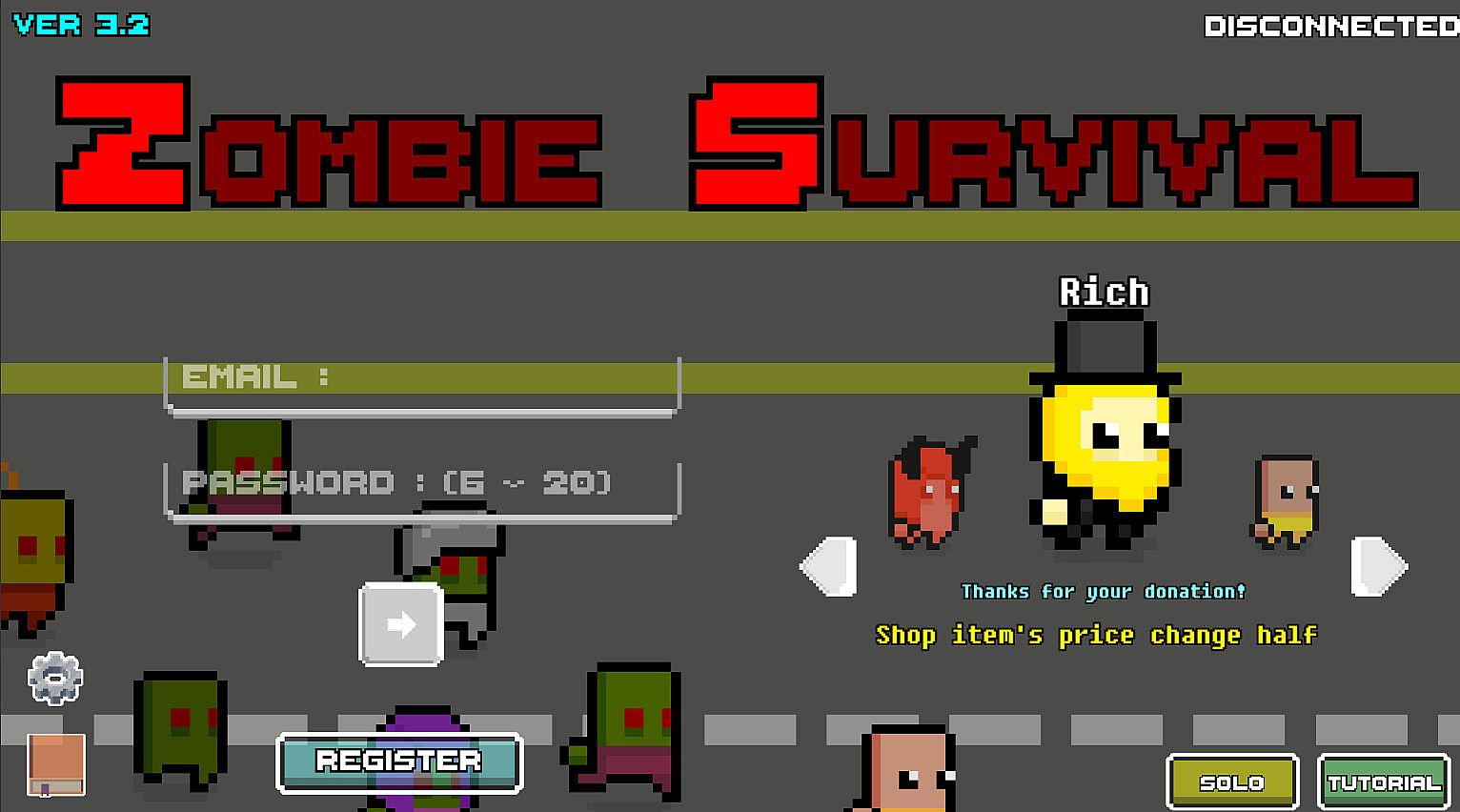 Before you start looking for a cheap Zombie Survival online - Add Charactor - Rich (Donate for Developer) key, check the essentials. Developed by SexyM. PC released date: 17 Jun 2021. Genres: Free To Play, Indie, Casual, Massively Multiplayer. Categories: Multi-player, PvP, Online PvP, Single-player, Downloadable Content, Steam Achievements.