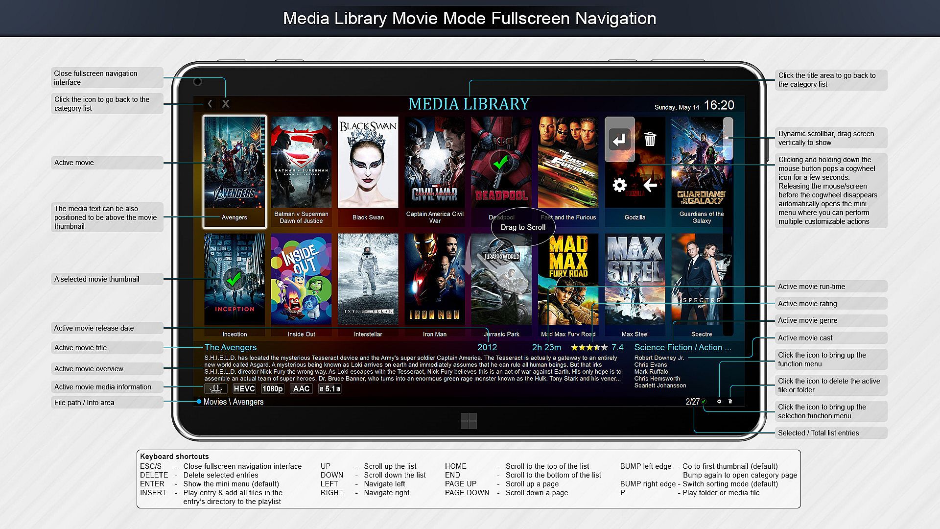 • Media library full height "wall of thumbnails" feature.