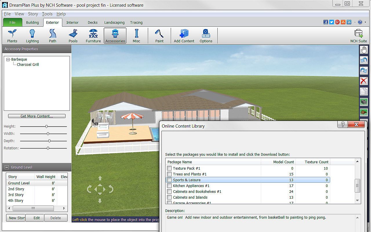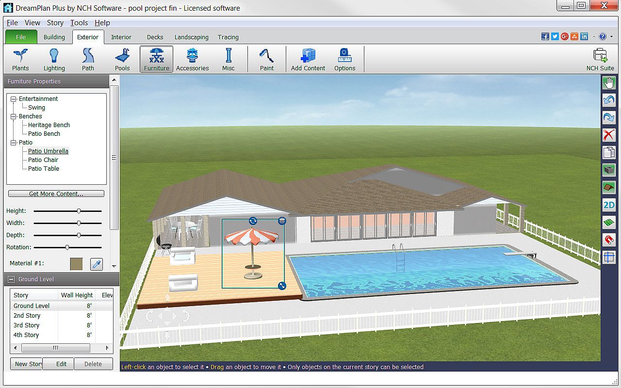 DreamPlan Home Design is a home and landscape design software designed with an intuitive and easy-to-navigate user interface that allows you to design any space in or outside the home. This 3D design software is perfect for any home project you may need to plan for. Create a stunning deck or swimming pool, map out the layout of your floor plan, or simply see how you would like your furniture arranged. With DreamPlan Plus, you have the flexibility of navigating to any view of your house or switching between 2D and 3D modes. When your project is complete, just take a quick screen shot of your plans and print. Whether to create a fun project or to build a home from the ground up, DreamPlan can give you a realistic design of your dream home, garden, pool, or deck!