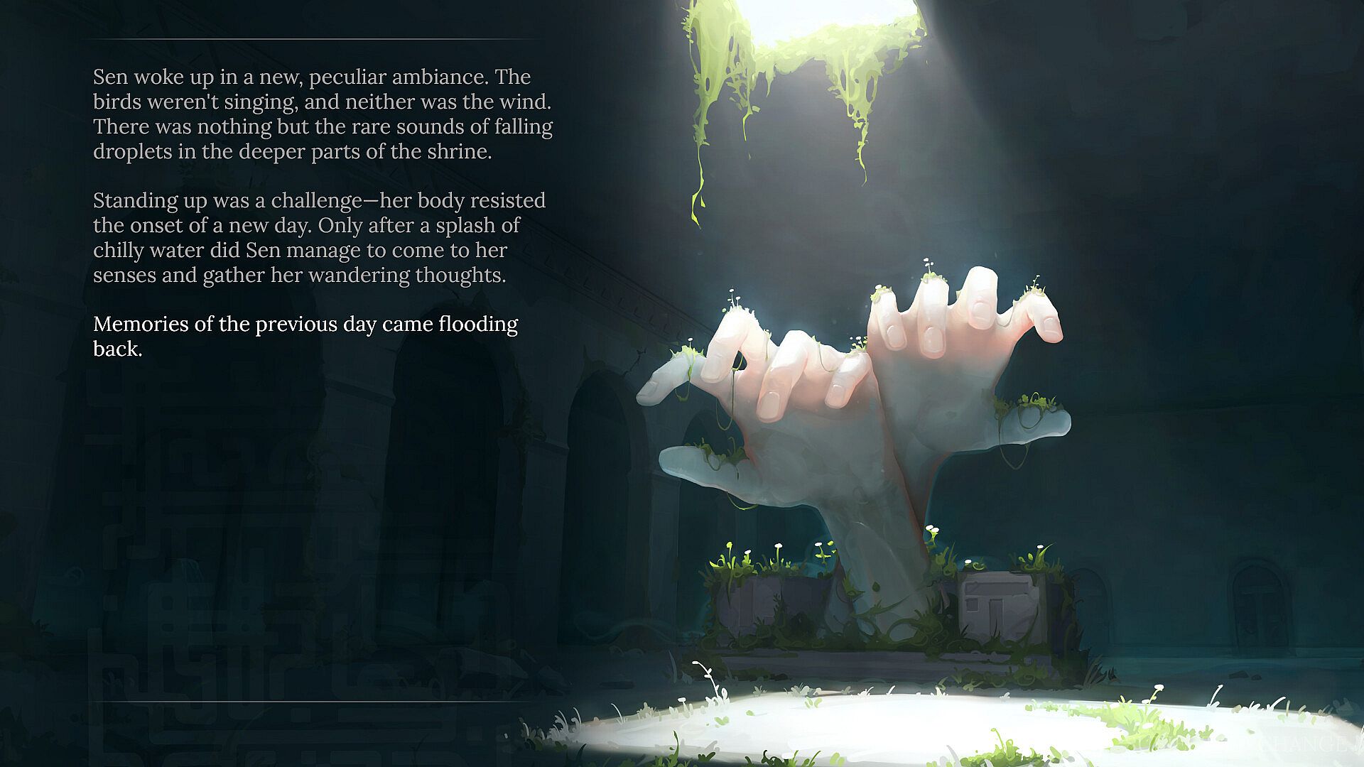 The washed-out red line traces a confident path away from the labyrinth city, toward the lands of dreams strewn with golden petals.