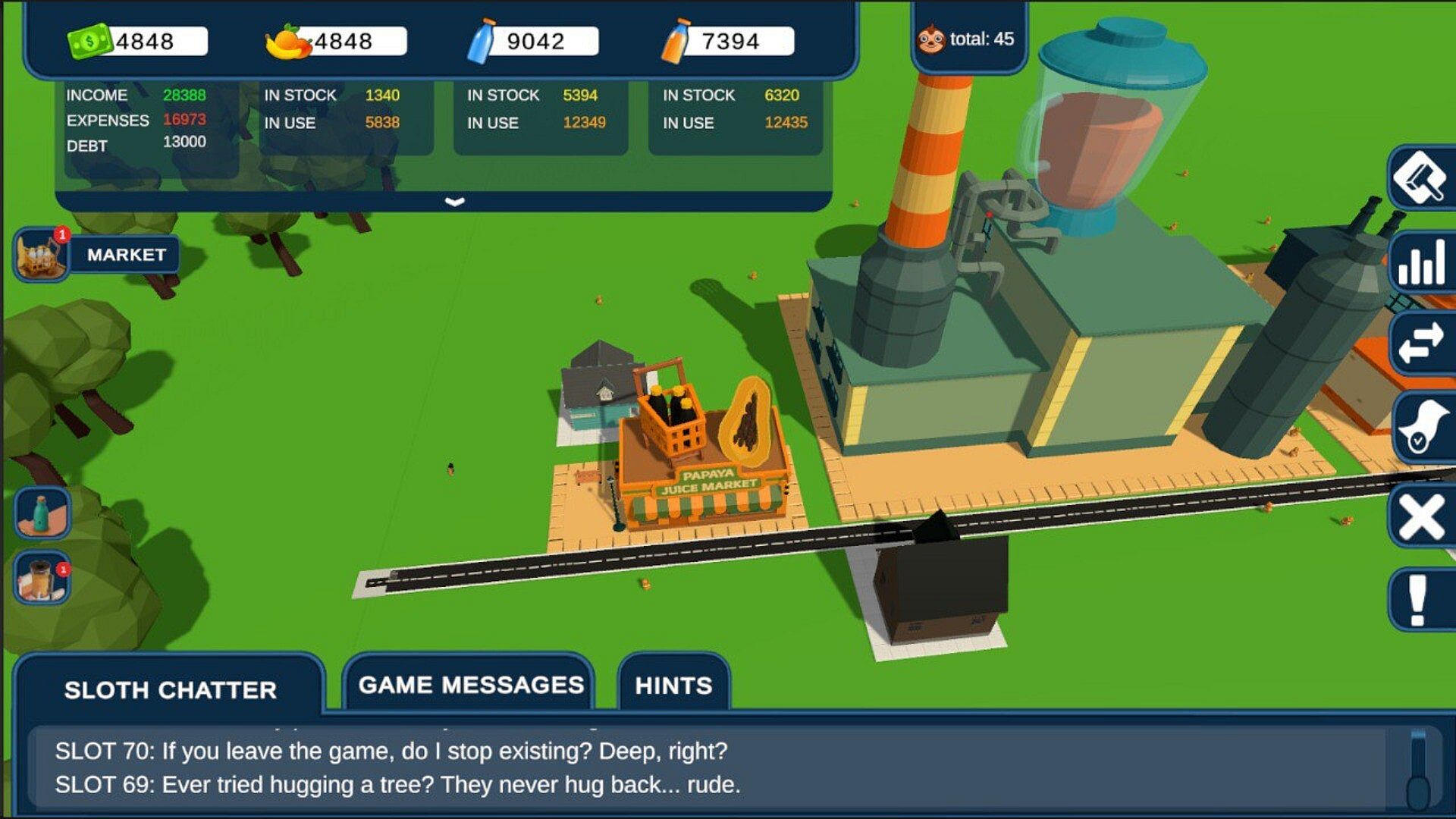 Imagine a bustling city where every single citizen is a sloth – goofy, cute, but also surprisingly hard-working. In the creation of their favorite Juice, you step into the shoes (paws?) of a sloth entrepreneur trying to take over the city's juice market. It's a lighthearted economic simulation meets multiplayer strategy game where you run your own juice business and compete with others to become the top juice tycoon in town.