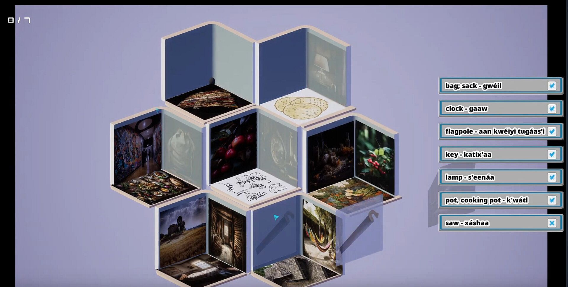 • Explore the Language – Navigate through immersive learning spaces, where everyday objects are labeled with their Tlingit names.