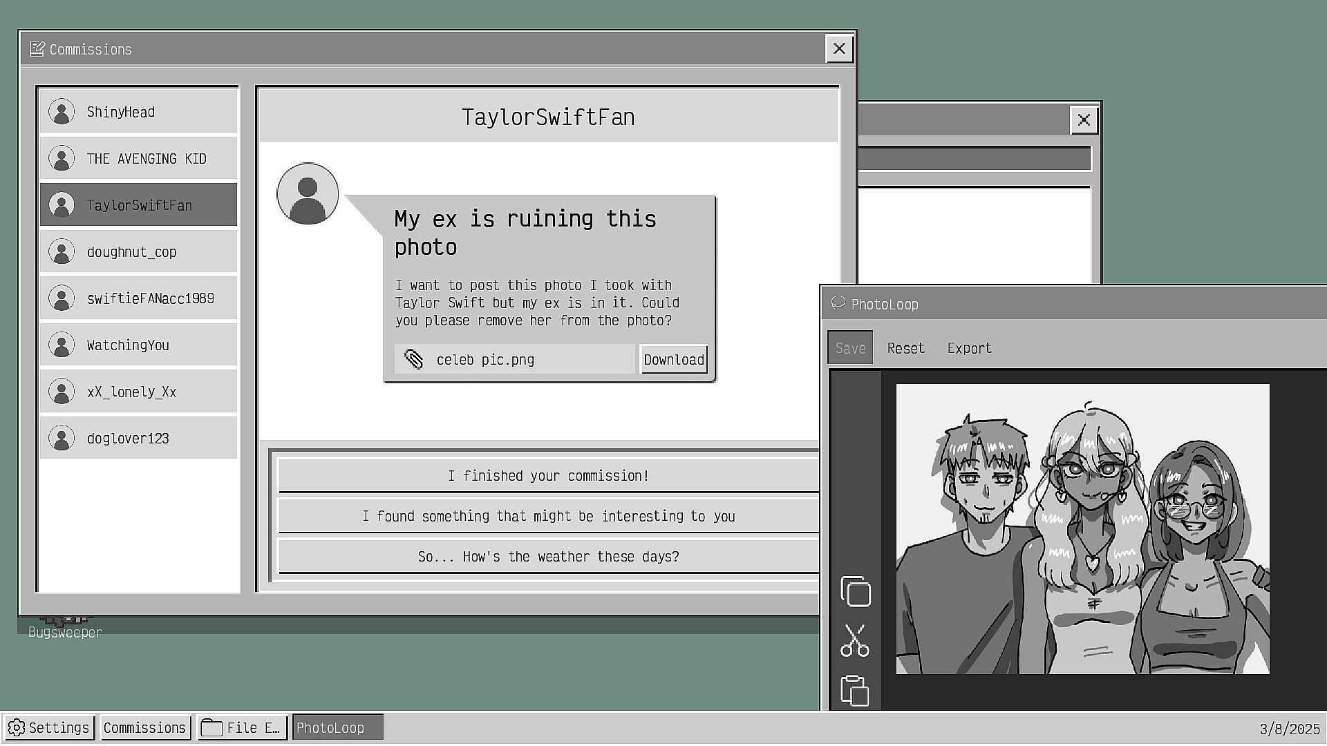 In a time of innovation and technological breakthrough, you somehow find yourself stuck with the world's oldest PC, equipped with the world's worst editing software. And after recently joining the ranks of the unemployed, you are left with little choice but to make money online in the best way you can think of: taking strangers' photo editing commissions.