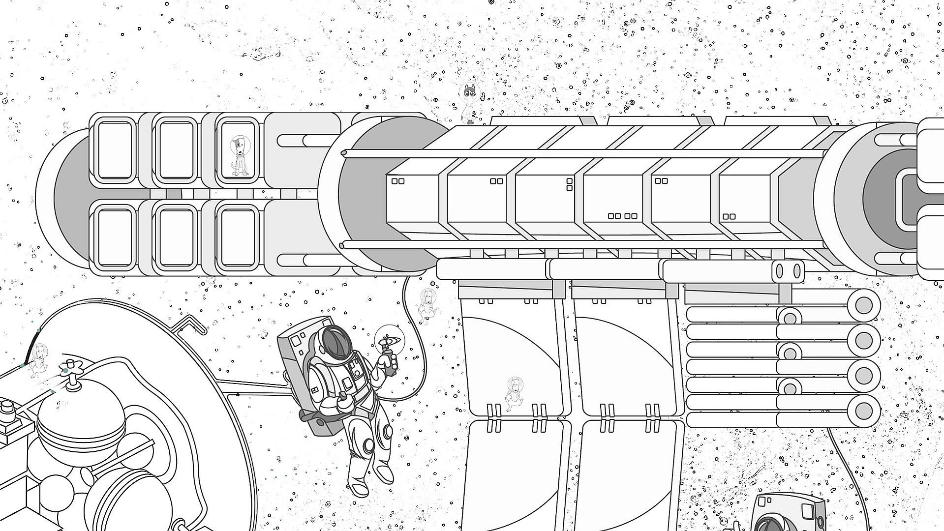It's a fun quest for Animalnauts among rockets and space race ship designs. It's a game with black and white drawings and illustrations.