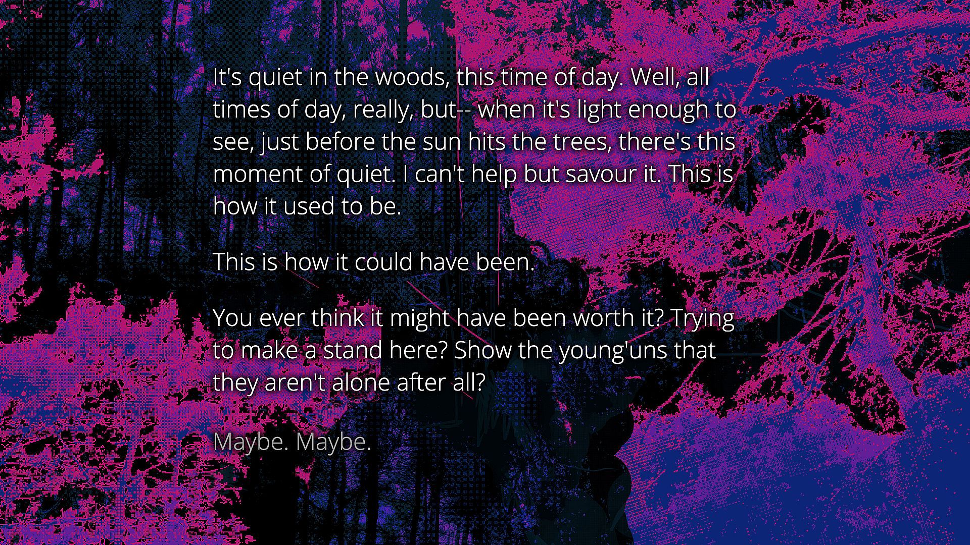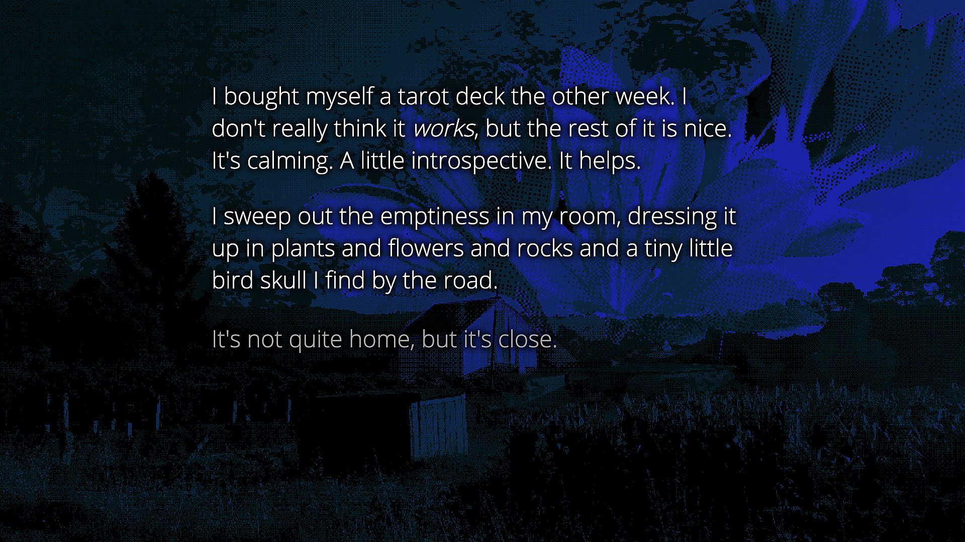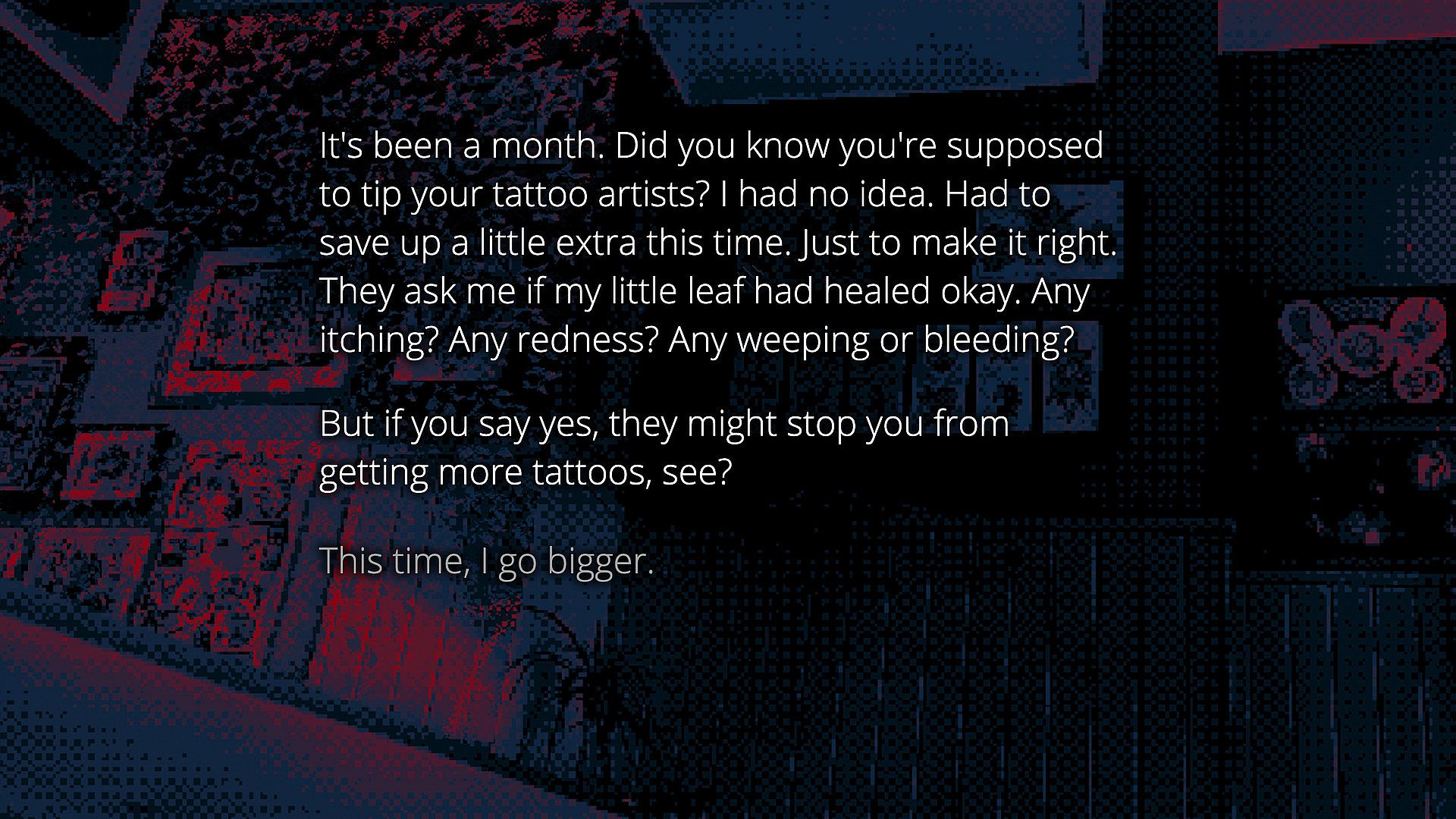 Cover Me In Leaves is an experimental work of interactive horror fiction, about bright minds, and the end of all things. Fresh out of high school, with no prospects or aspirations, you've remained here in your small town. Everyone you knew and loved has moved on for better things. You're alone. So you get your first tattoo.