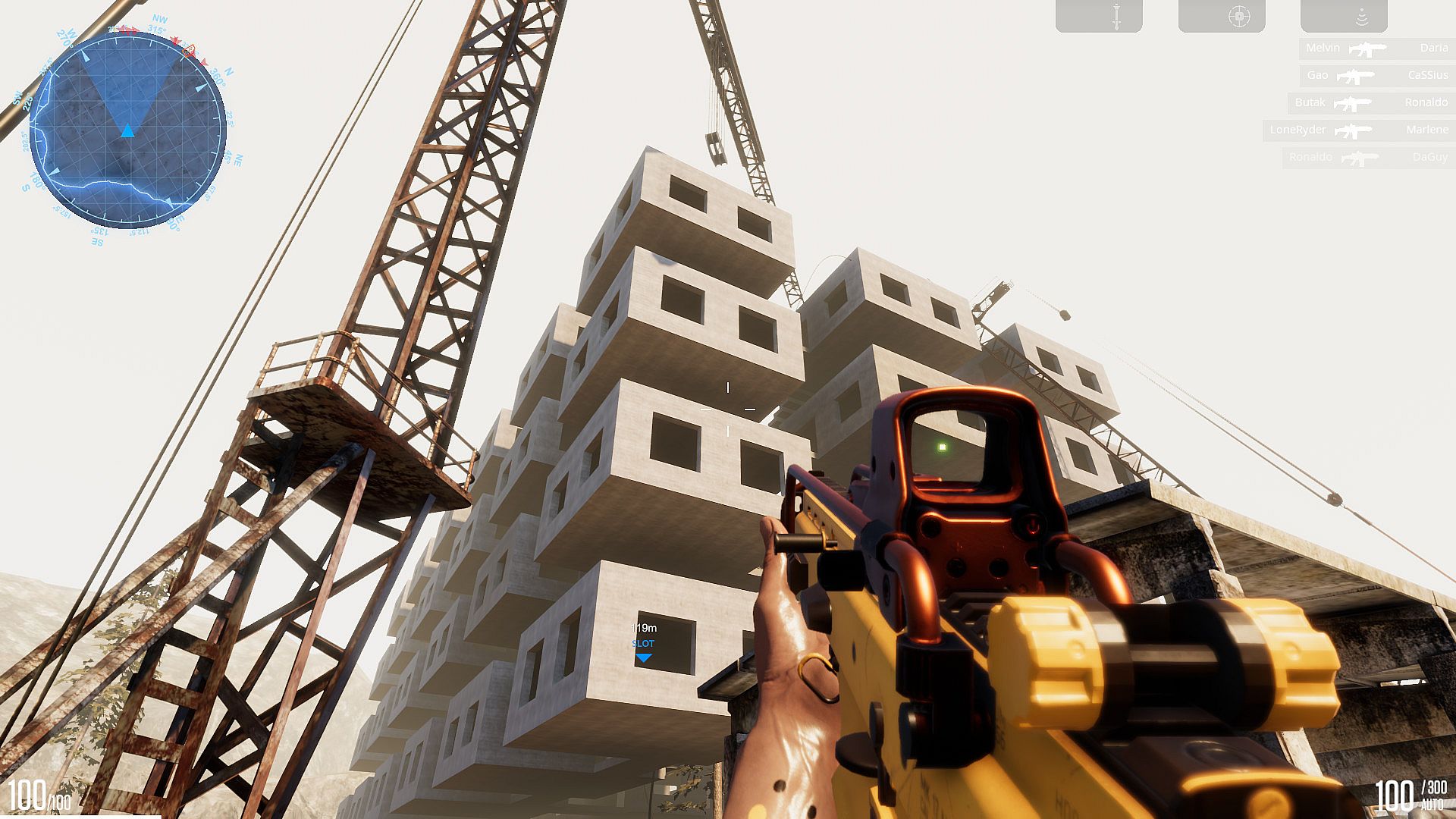Find chips in the field that switch the SR77 from a fast submachine gun to a silent bow, sniper rifles, or even powerful fire and grenade launchers.