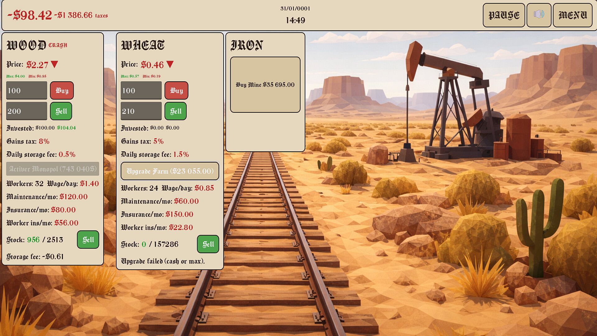 In 1889 Trade, you manage production and trade volatile commodity markets. Start small with Wood and Cereals, then expand into new resources as you grow your operations. Prices move over time—sometimes calmly, sometimes violently—so every buy, sell, and upgrade matters.