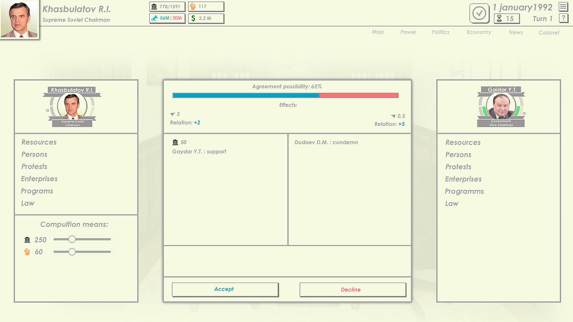 You have four types of resources at your disposal: capital, public support, power, and authority. Which of these will help you rise to the top? Keep in mind that every choice has consequences, both for you personally and for the entire country.