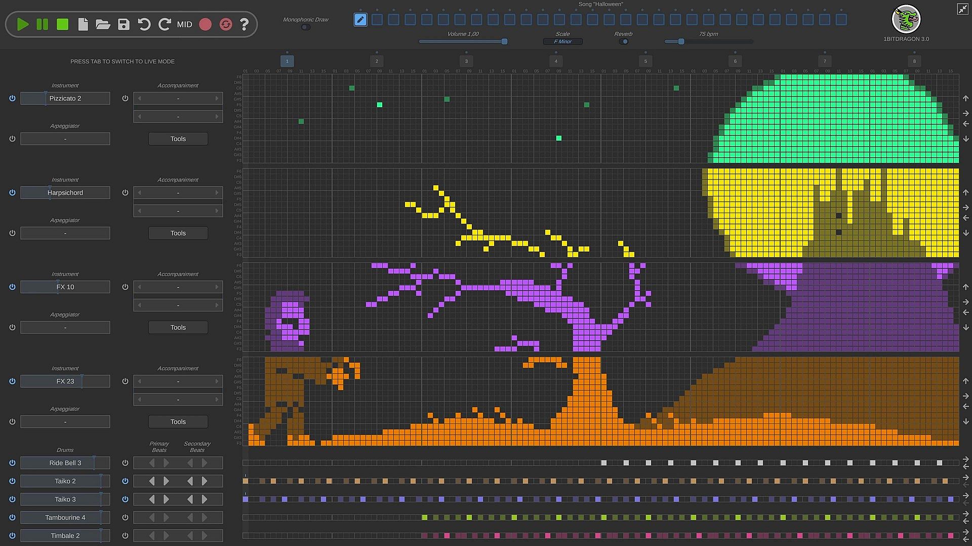 There are 223 instruments and 275 drum samples so you can make a ton of music across a bunch of genres without having to get outside of 1BITDRAGON.
