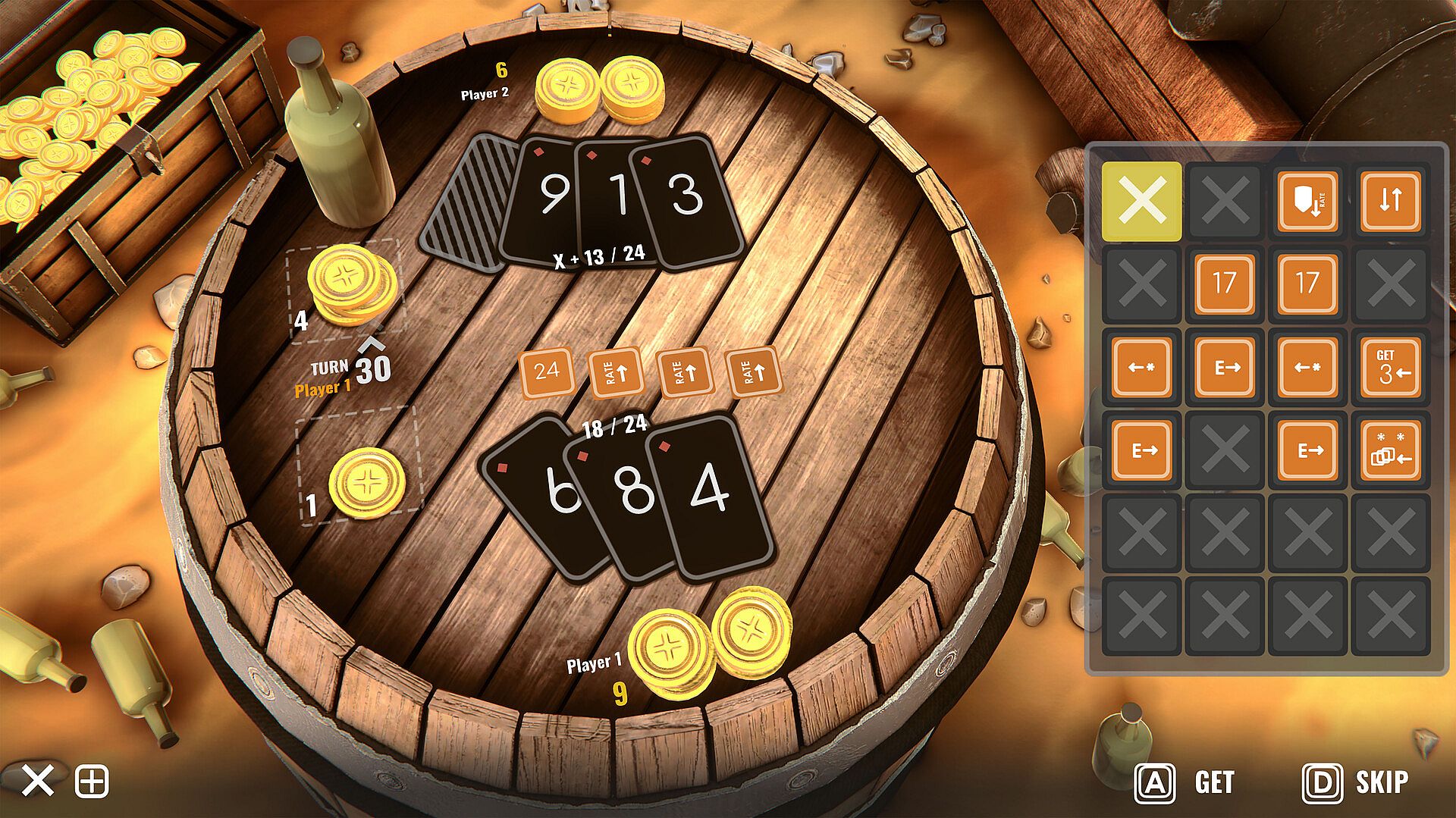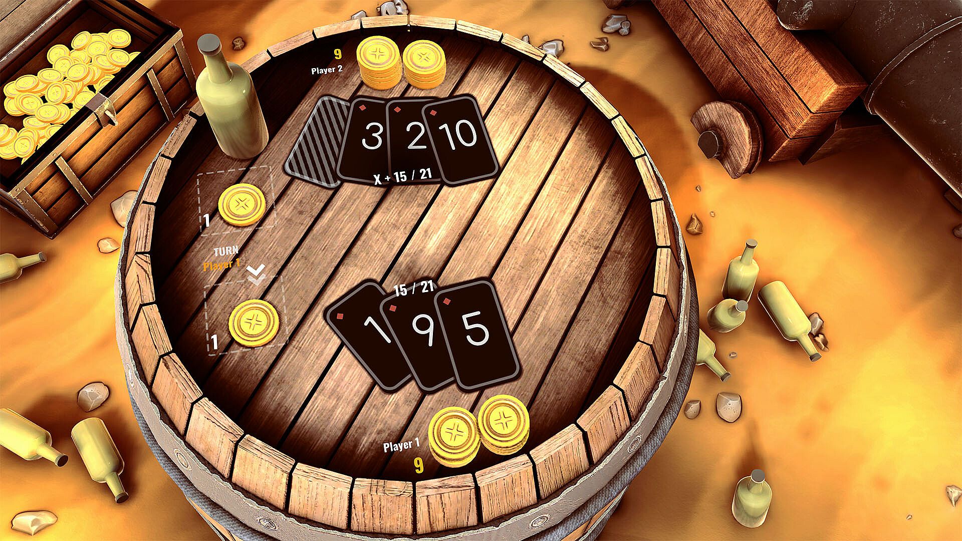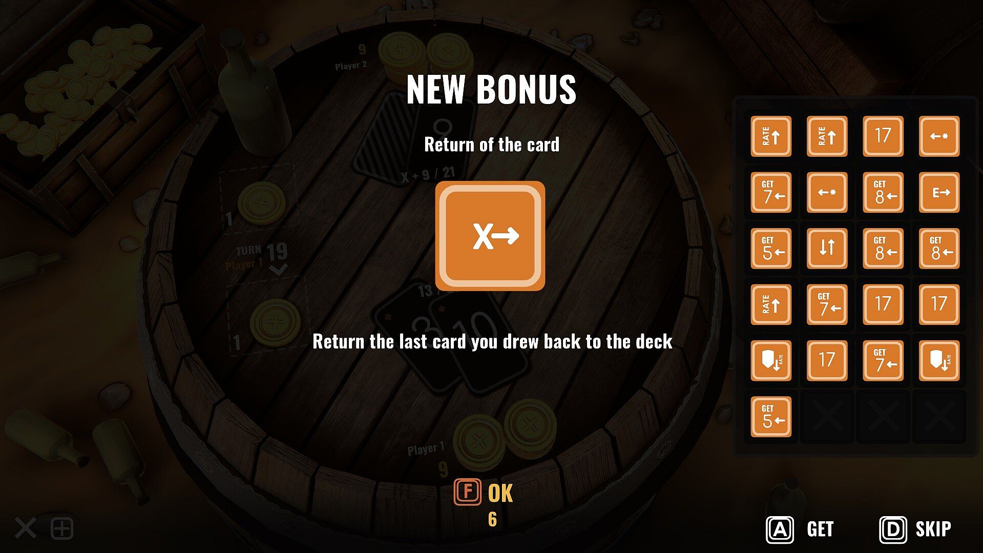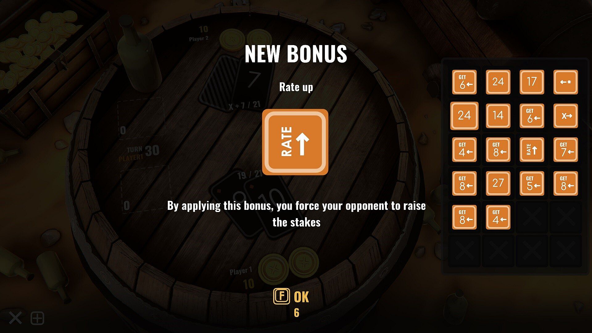 There are 11 cards in the deck; at the beginning of each round, each player is dealt two cards, one of which is hidden from the opponent. You can either take a card or pass your turn. Your goal is to get the card total as close to the target value = 21 as possible, but not more. The player who collected a combination of cards closer to this value wins, however......Using bonuses radically changes the gameplay