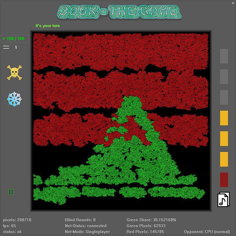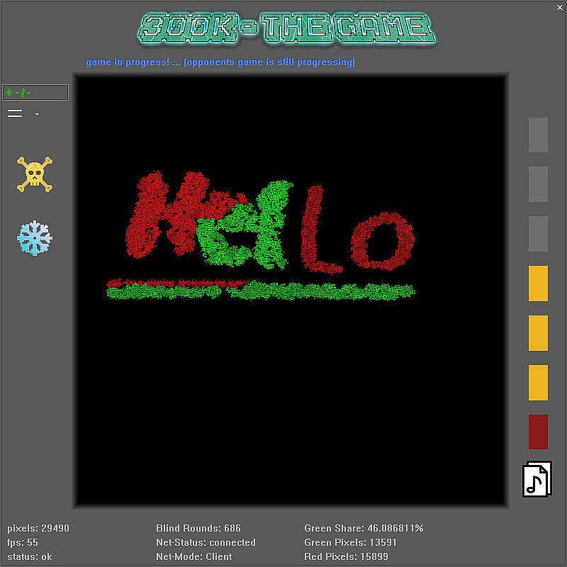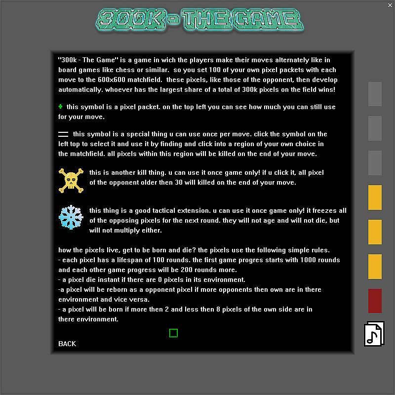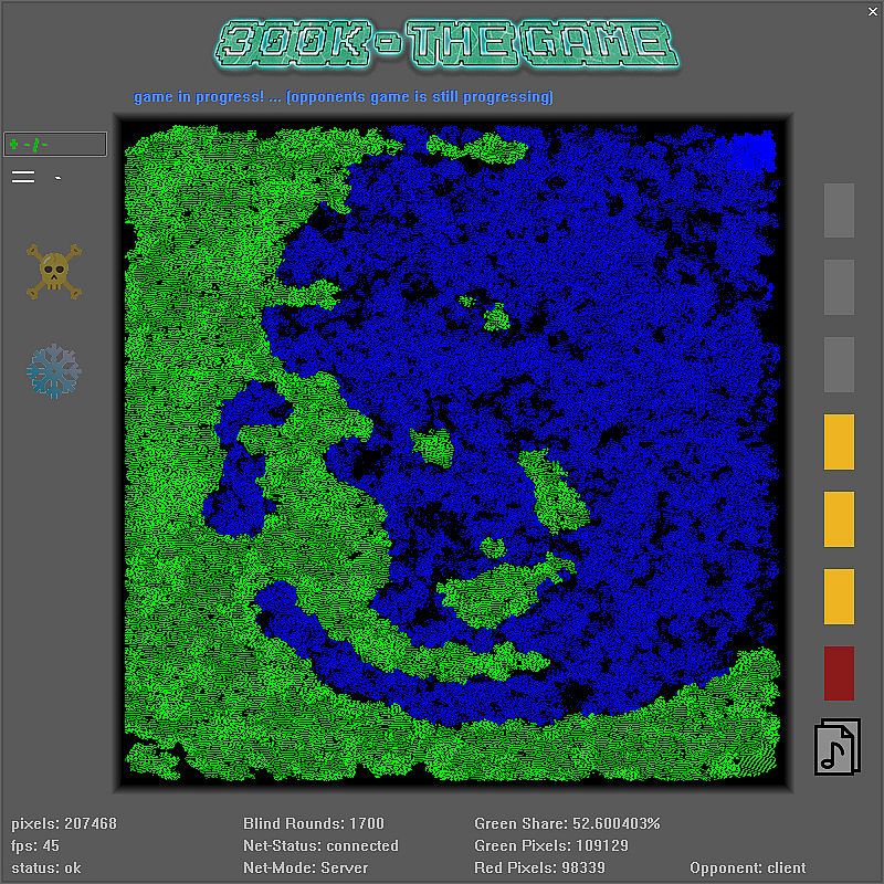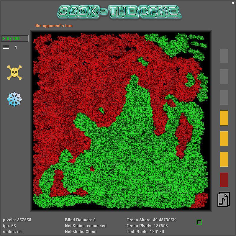 or quickly said: it's a game in wich the players make their moves alternately like in board games like chess or similar. so you set 100 of your own pixel packets with each move to the 600x600 matchfield. these pixels, like those of the opponent, then develop automatically. whoever has the largest share of a total of 300k pixels on the field wins!