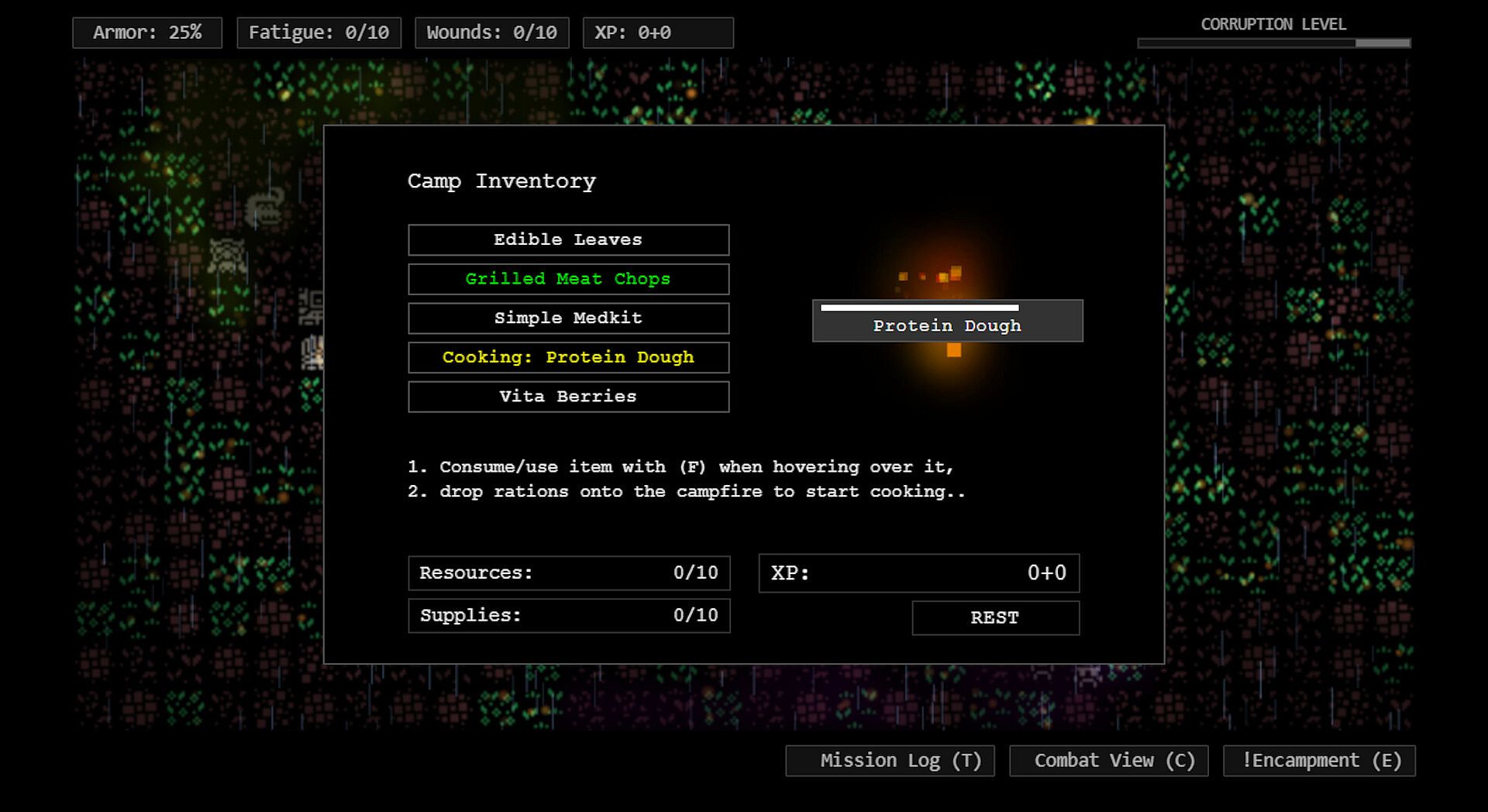 As you survive, fight enemies, and complete missions, you earn experience points that can be spent to increase your abilities, making you more resilient and effective in the ongoing battle. When you're not fighting, you can rest in your makeshift camp to recover wounds, cook food, and spend your XP. Heal your wounds and soothe your fatigue by combining items with the campfire to make foods edible or change their properties.