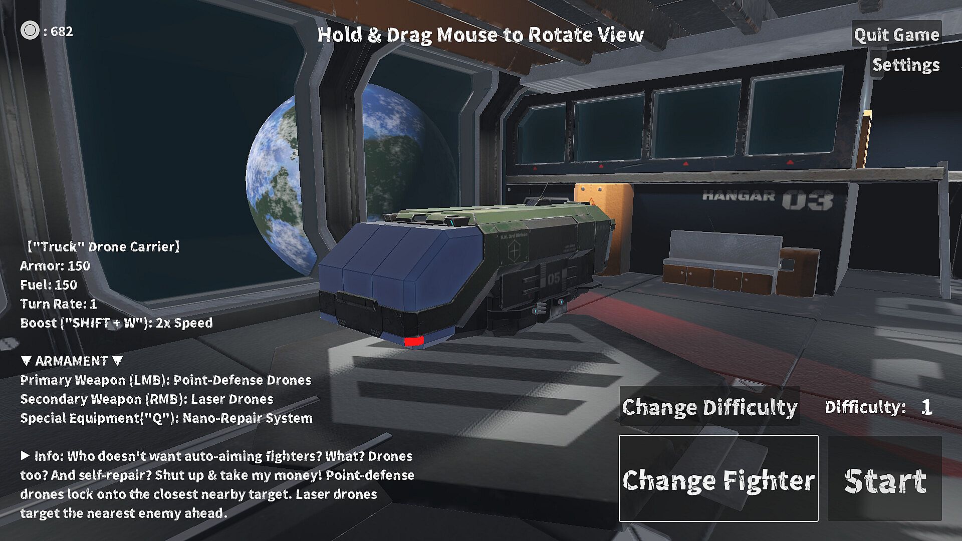 Difficulty 1 is relatively gentle: after 5 minutes of combat, a random boss will appear, with slightly fewer rewards. It is ideal for familiarizing yourself with space fighters and stably earning in-game currency.