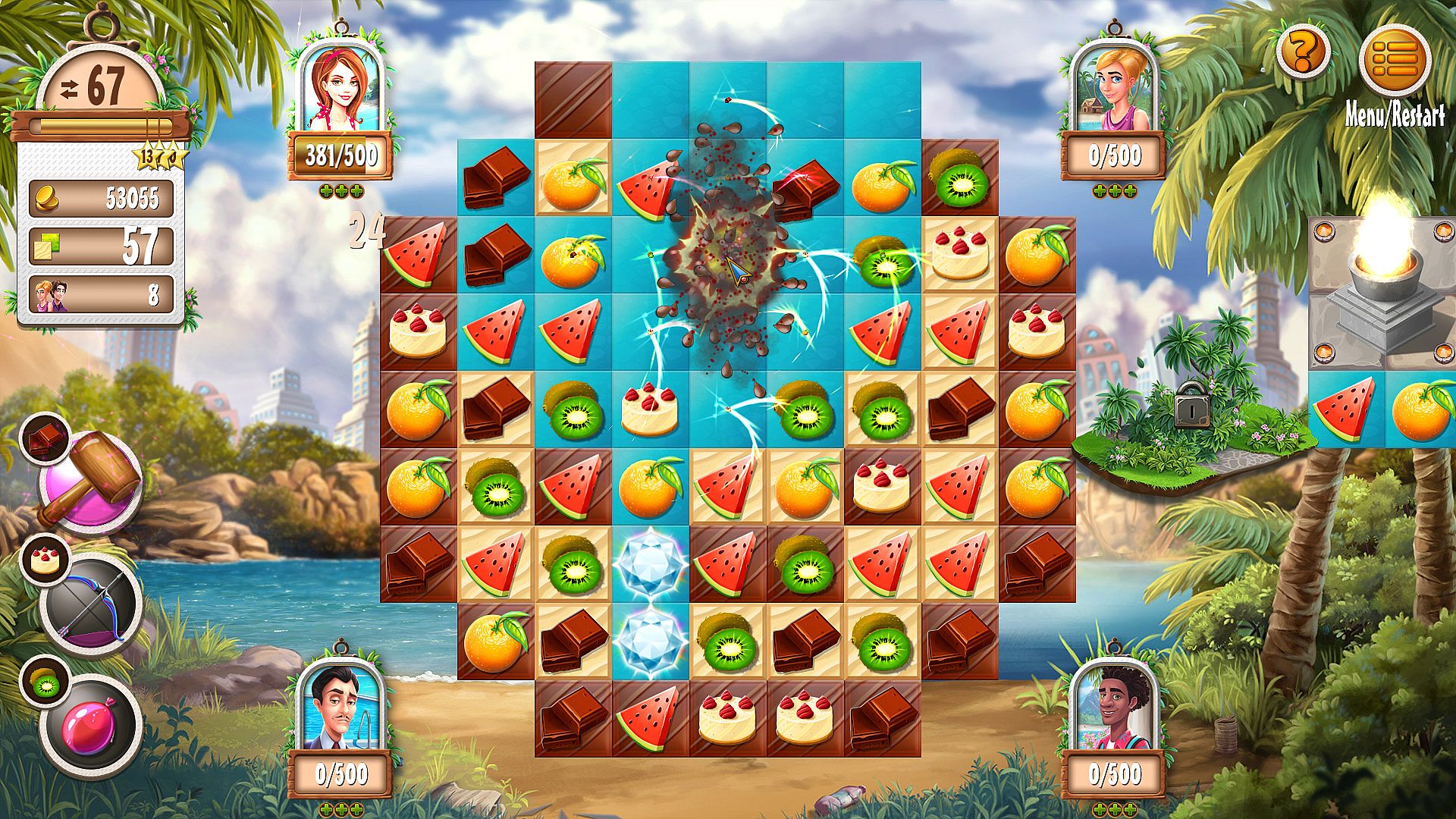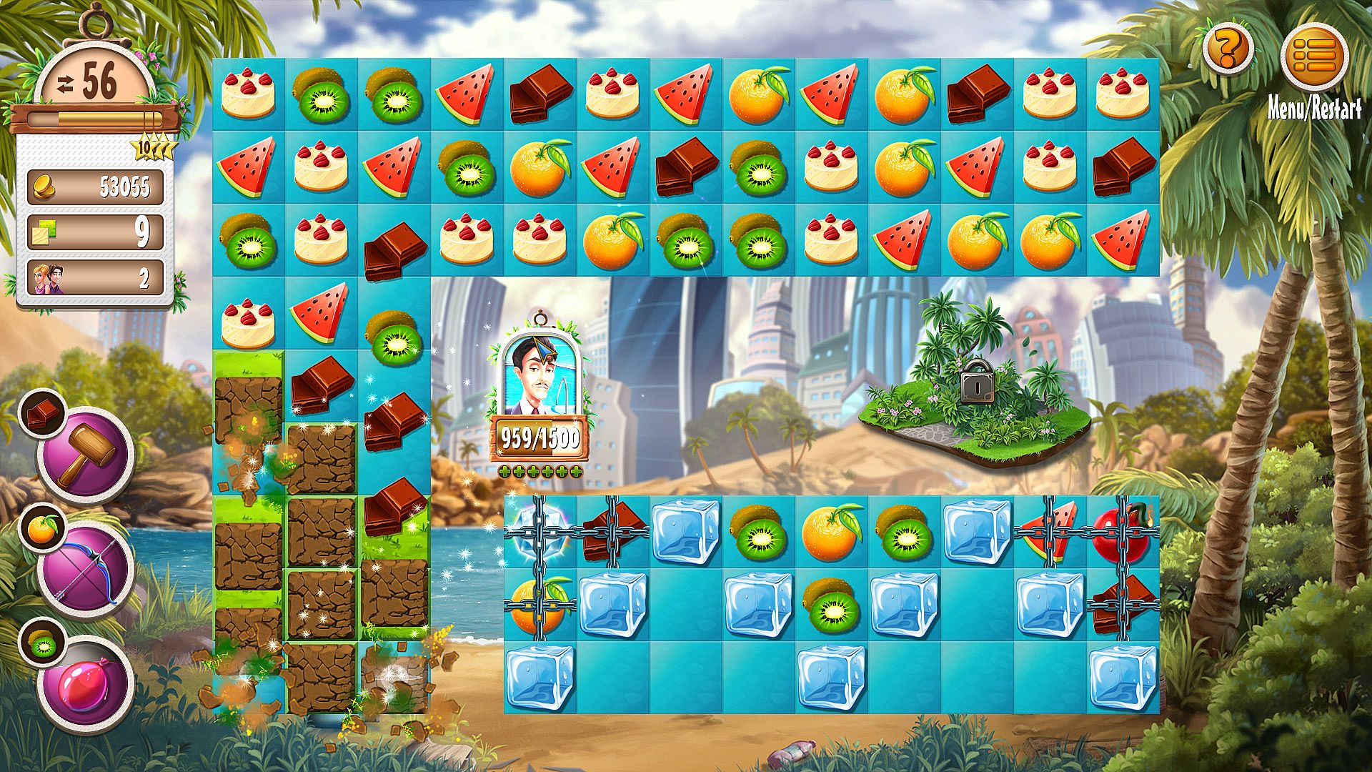 Soon you'll realize that things are quite different in Magic City: now you have to overcome obstacles on linked boards. In some cases you need torches to actually see obstacles. Buildings influence your gameplay, too. As soon as the first guests arrive at your hotel you have to keep their satisfaction level as high as possible.