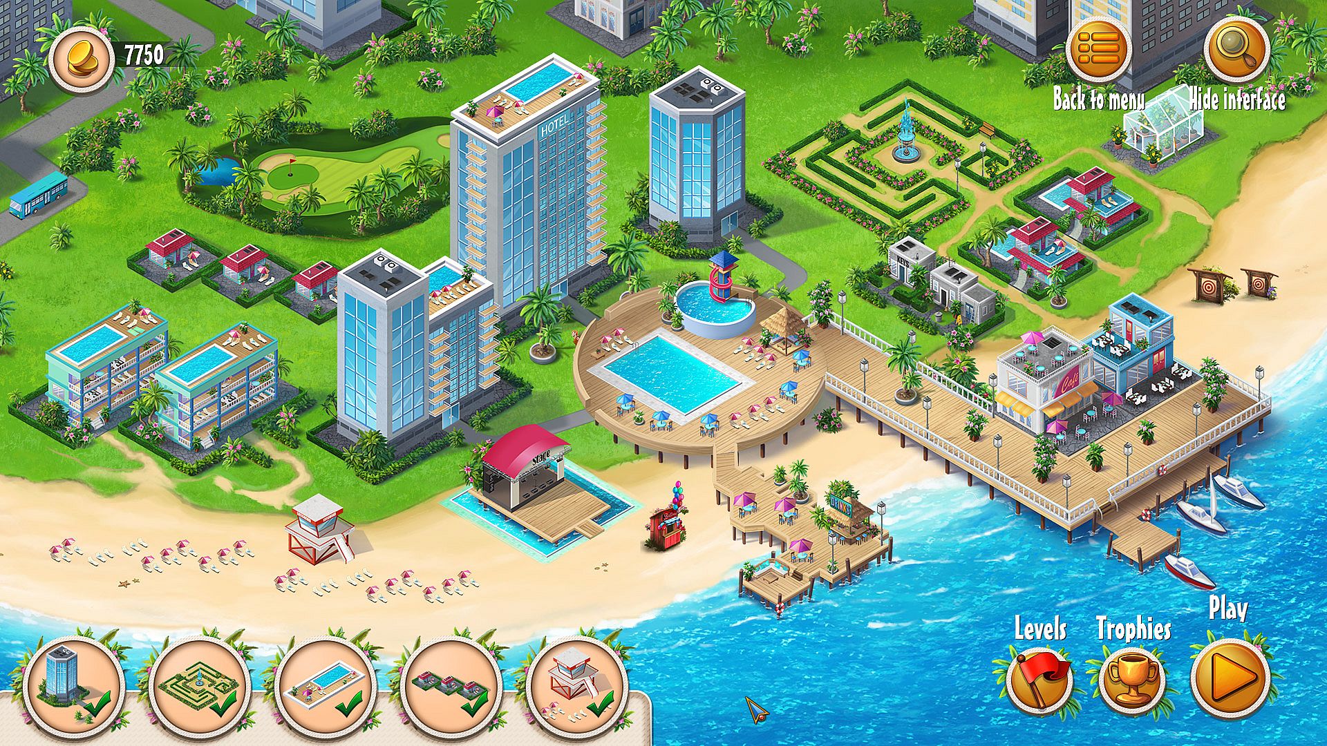 - Clever hotel construction: Create a mega hotel resort with 25 buildings which impact your gameplay