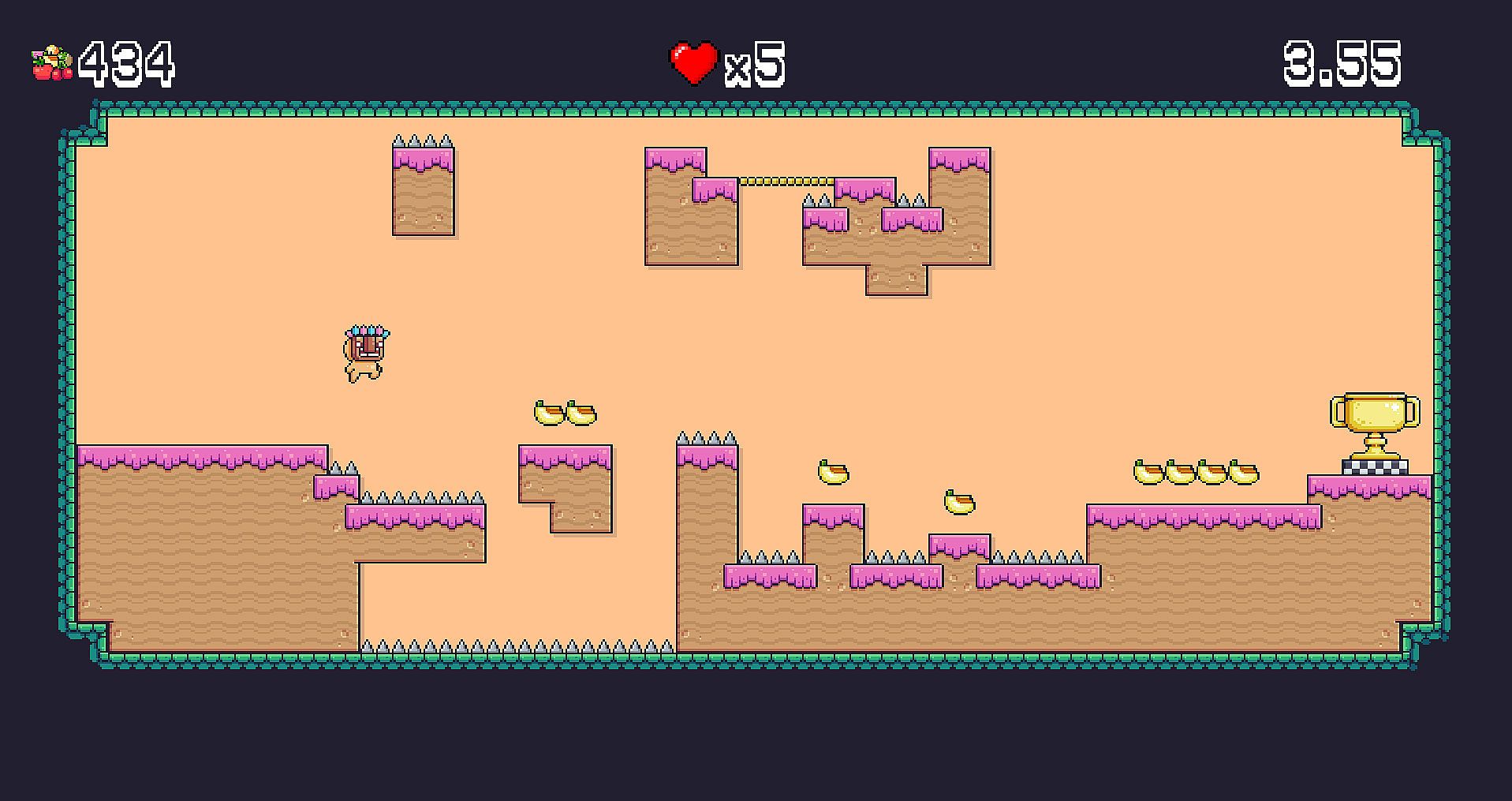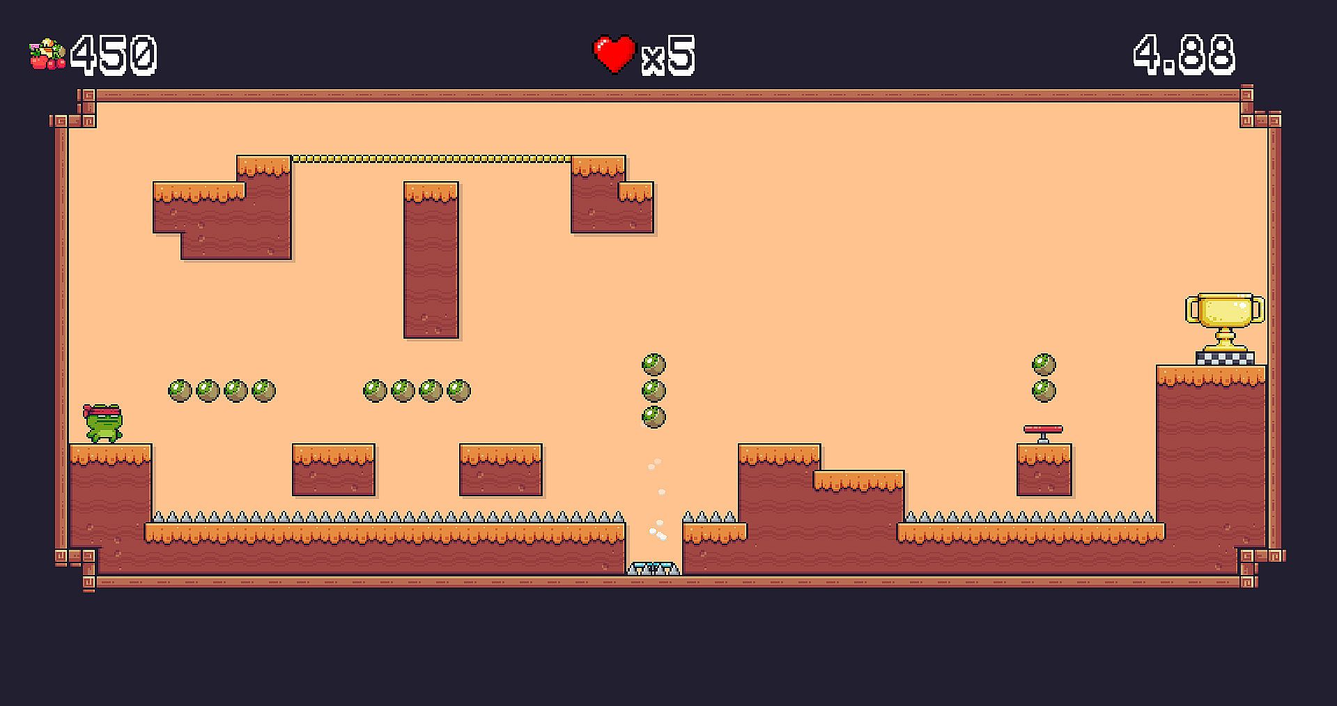 In magical valley the fruits is ripe. Citizens of the valley decided to find the most capable of them to harvest the fruits. And they make the contest - who will gather fruits in 6 seconds, will be the honored fruit farmer! Jump over the obstacles, don't fall on spikes, and most important - don't stop, or the flame will burn you.