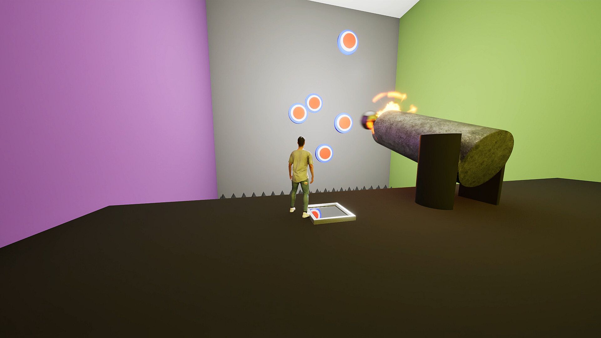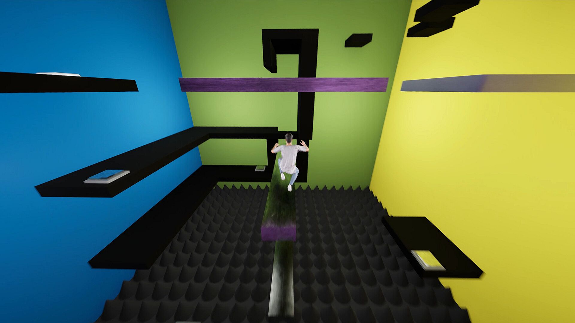 Pressing a switch activates gravity toward the matching face, causing the cube to fall in that direction—sometimes onto walls, sometimes even onto the ceiling.
