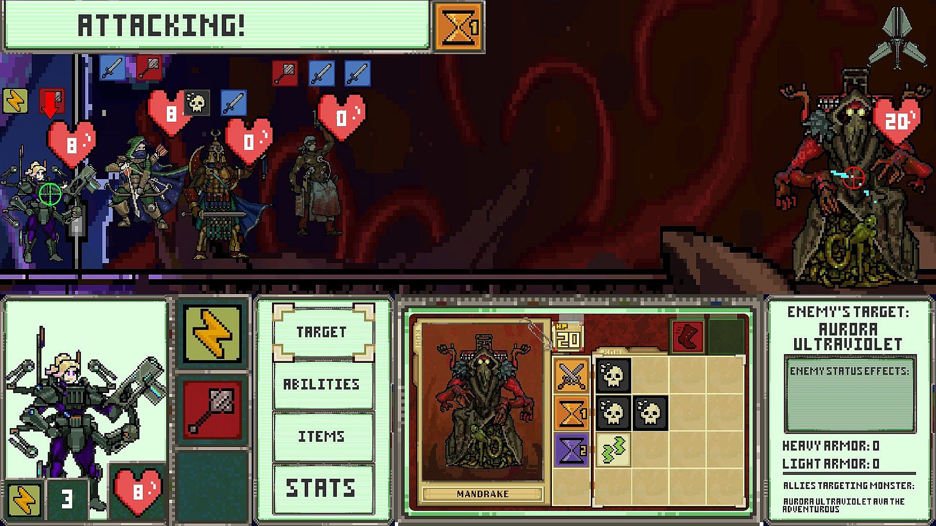 8-Bit Attack: is a turn based tactics game where the player takes control of a hodgepodge of heroes from across multiple fantasy universes, and commands them as they defend the galaxy from evil. The evil lord Cthulhu and his minions of darkness threaten the destruction of all life as we know it, it is up to your strategy and wits to stop him. Battle through 4 types of levels before having to face the final boss himself, outfitting yourself with more gear and upgraded characters after each successful fight. Careful planning, coordinate attacks, and unique abilities are crucial in deciding whether your team emerges victorious, or falls victim to the invading monsters.