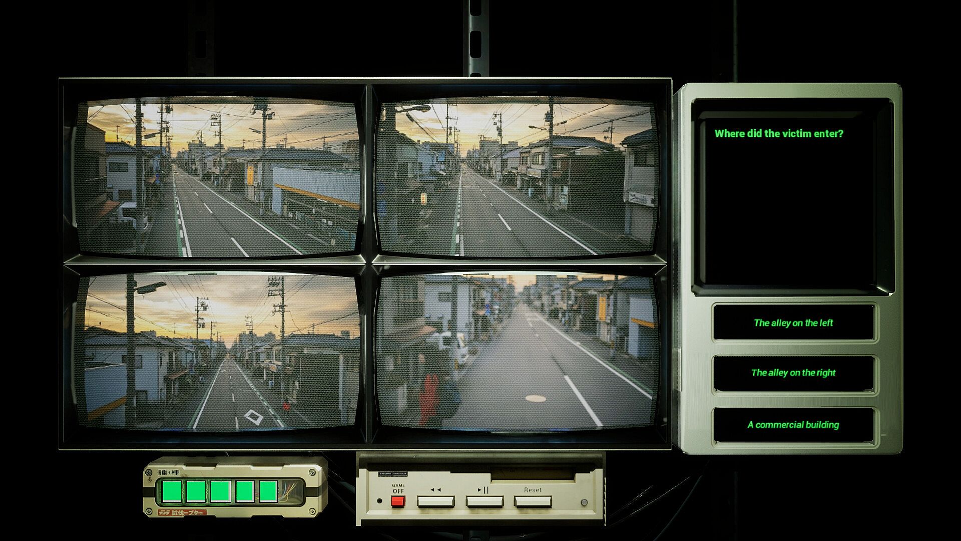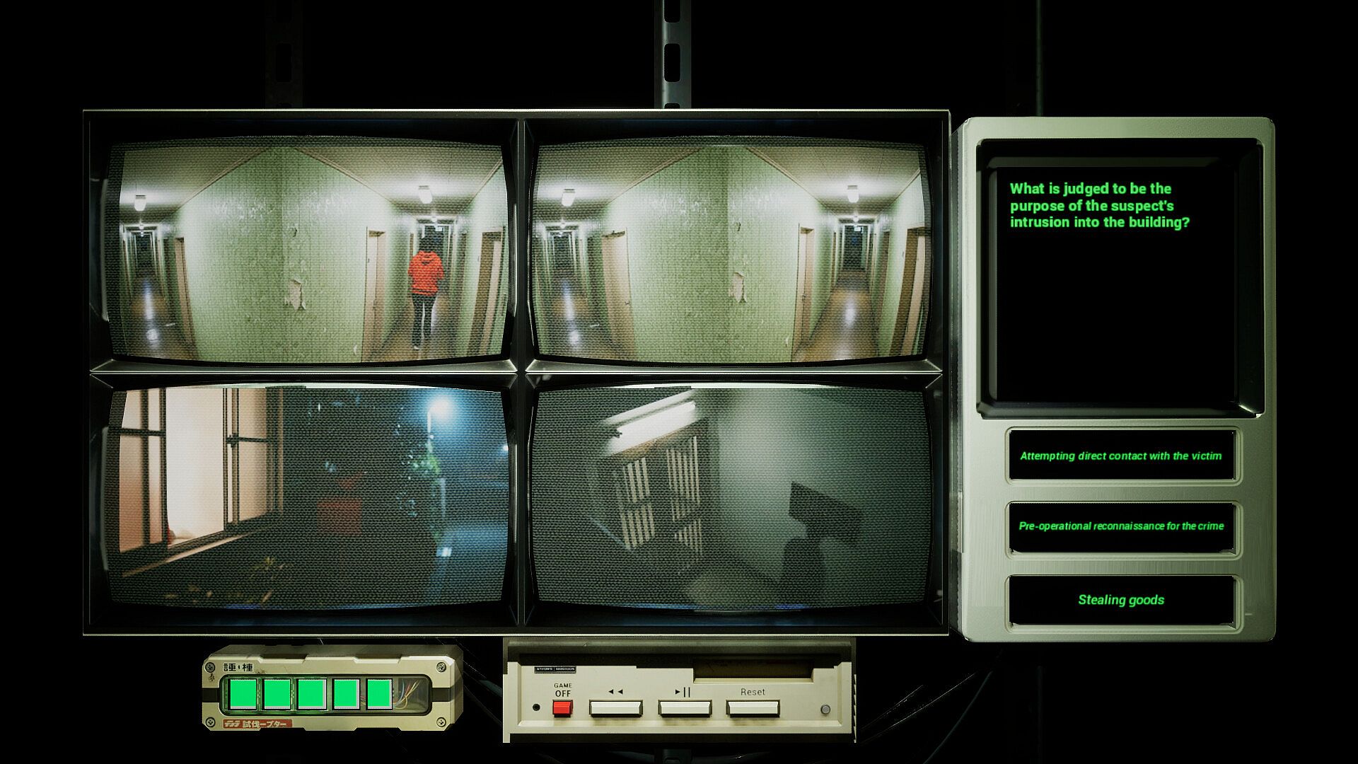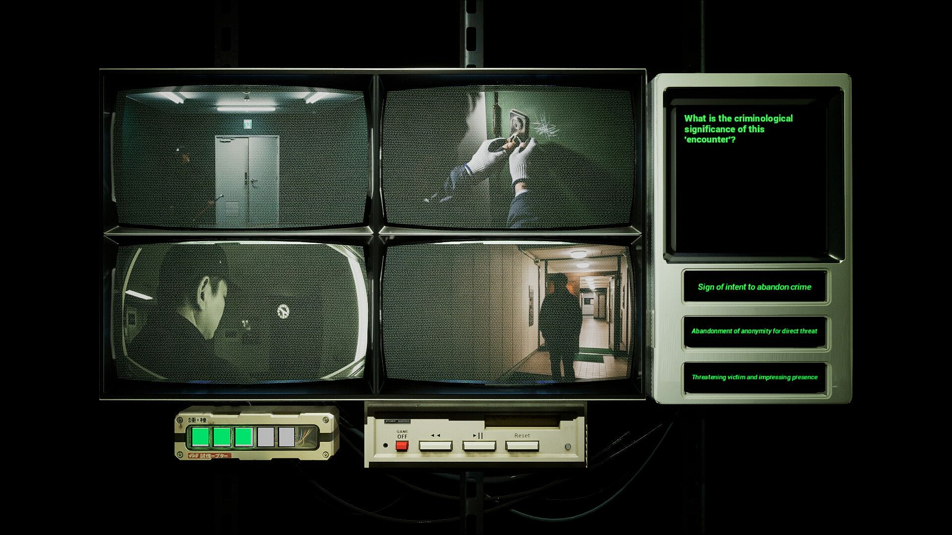 • 7 Days of Mystery: To solve the three unsolved cases (Case 1: Stalker (ストーカー), Case 2: The Ritual (儀式), Case 3: Quiet Gardener (静かな庭師)) , you must intensively analyze 7 days' worth of CCTV footage for each incident. A new video is unlocked each day.