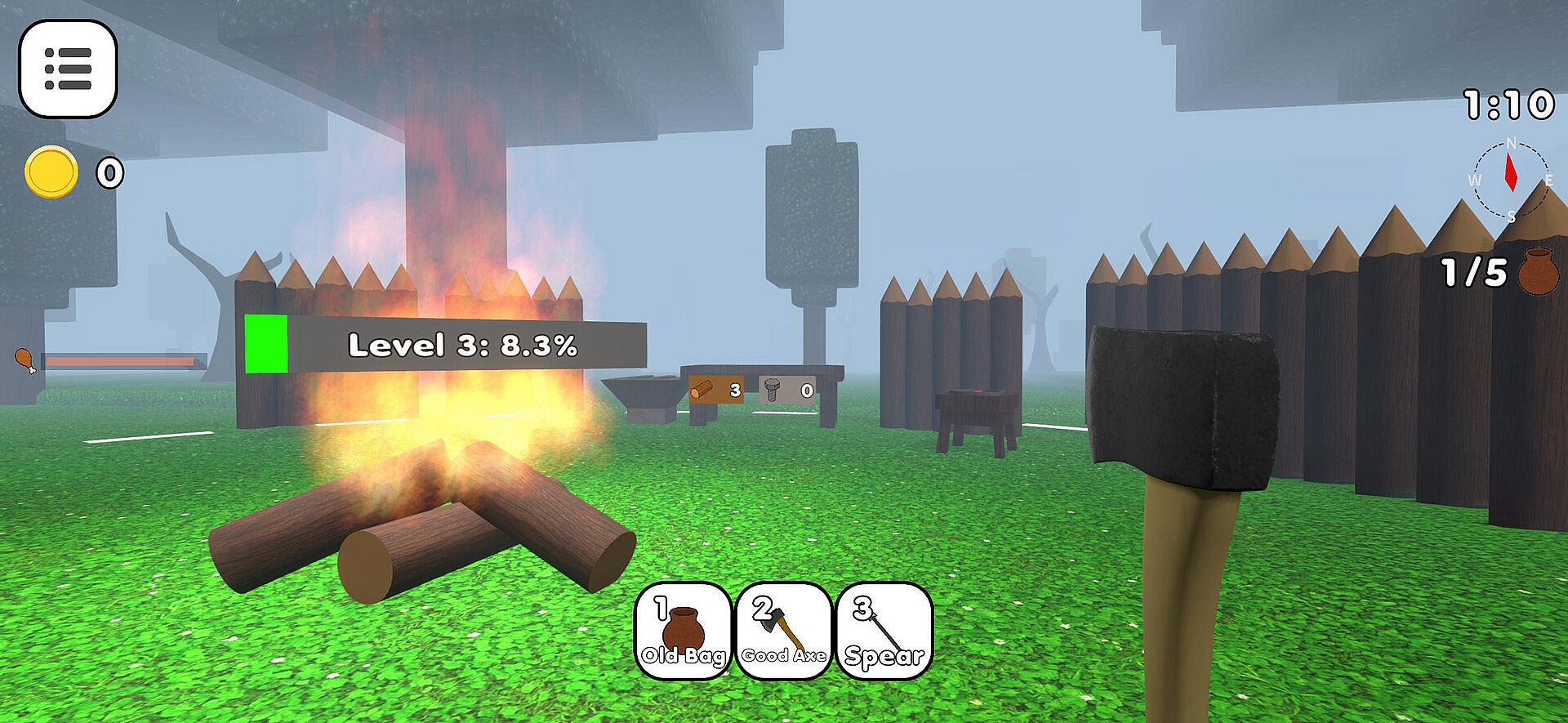 The heart of your survival. The fire creates a safe zone that keeps the Bonehorn monster away and protects you from the night. Feed it with wood, coal, and fuel to keep it alive. Upgrade it to expand the explorable area, cook food, and reveal more of the wilderness. If the fire dies, you are no longer safe.