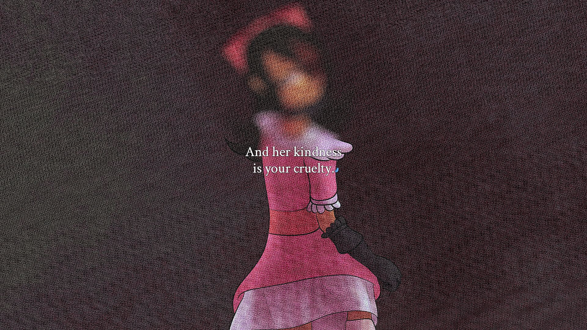 These are the title of the Distortions that Perdita can meet through her story. They do not wield names like ordinary Humans, instead sporting a title that distills who they are into a neat, digestible phrase. Every Distortion has a story of their own to reveal during the course of gameplay, and the information they divulge depends on who Perdita is. From a cruel, mirror-bound Distortion reaching for a holiness not meant for her, to an erratic dragon whose nature is the product of a tragedy, no two monsters are the same. Their words and actions will change who Perdita becomes, as well, shaping her moral compass and what she believes is right.