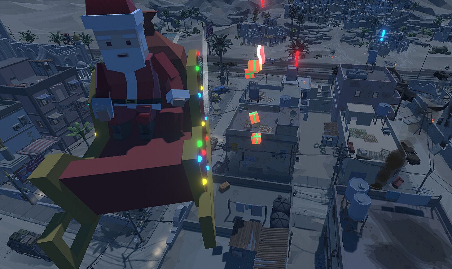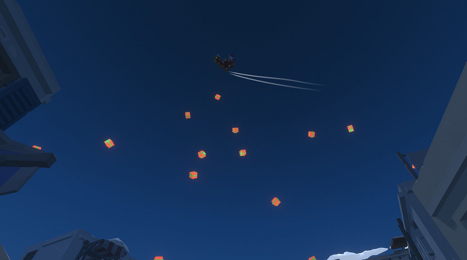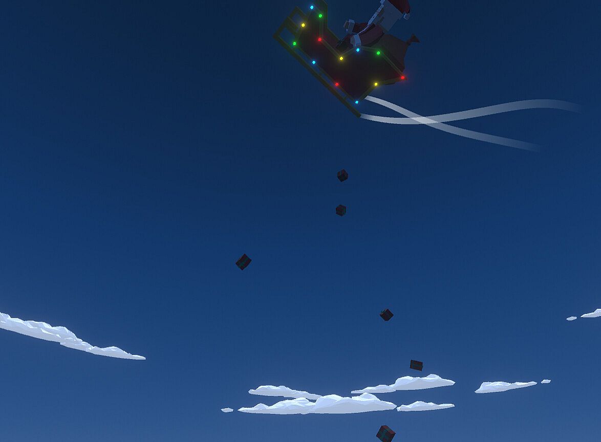 Fly around as Santa with a mouse-based flying controller in an infinite procedurally generated world, delivering presents to children on the Nice List, giving coal to those on the Naughty List, and delivering Christmas cheer to those on the Hit List. Each household is specially marked for easy recognition of what they should receive: a blue exclamation mark for those who have been nice, a red exclamation mark for those who have been naughty, and a stick of dynamite for those who need some extra Christmas cheer! Avoid rockets fired from missile launchers dotted around the map that are trying to keep you from giving Christmas spirit!