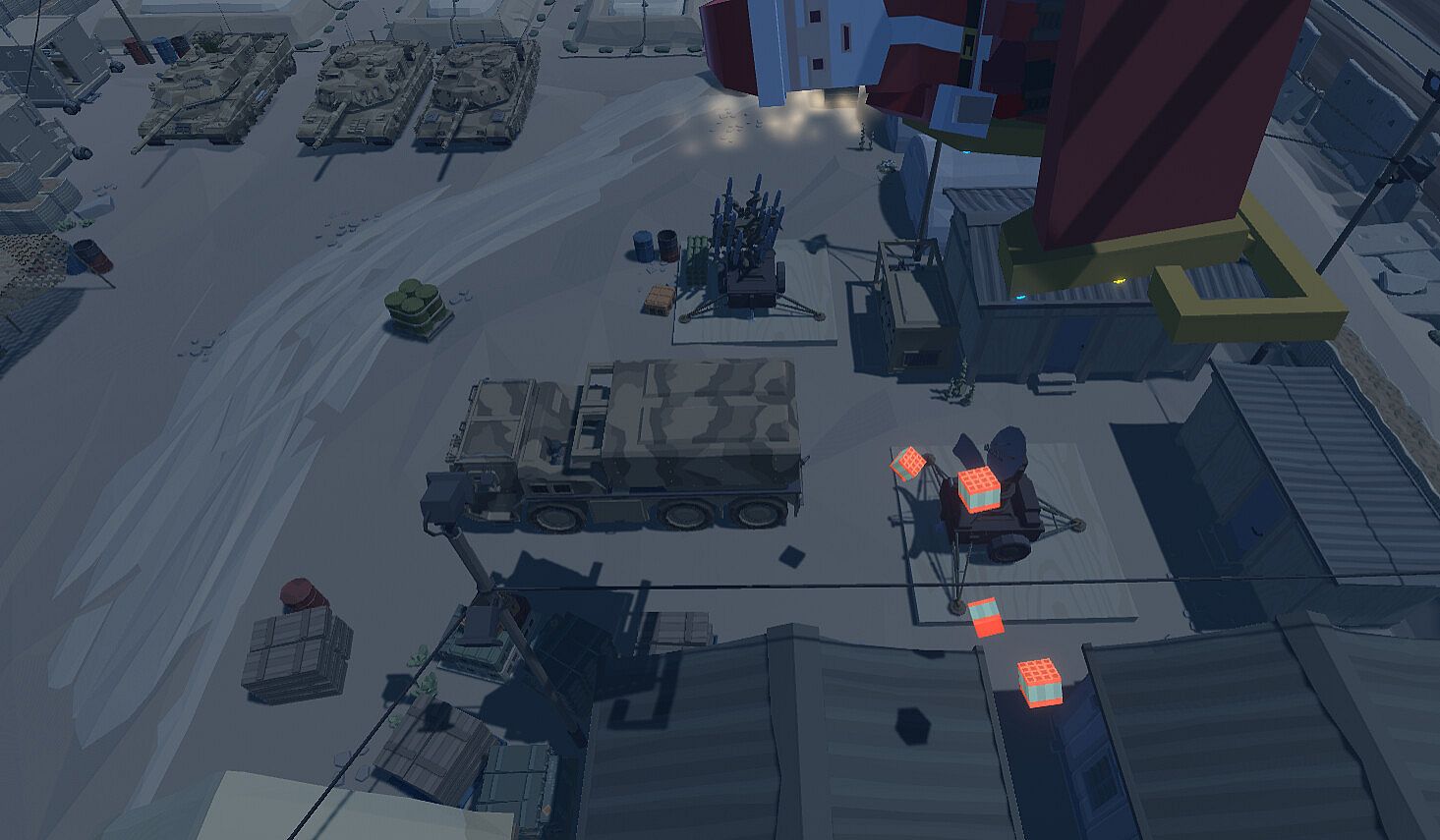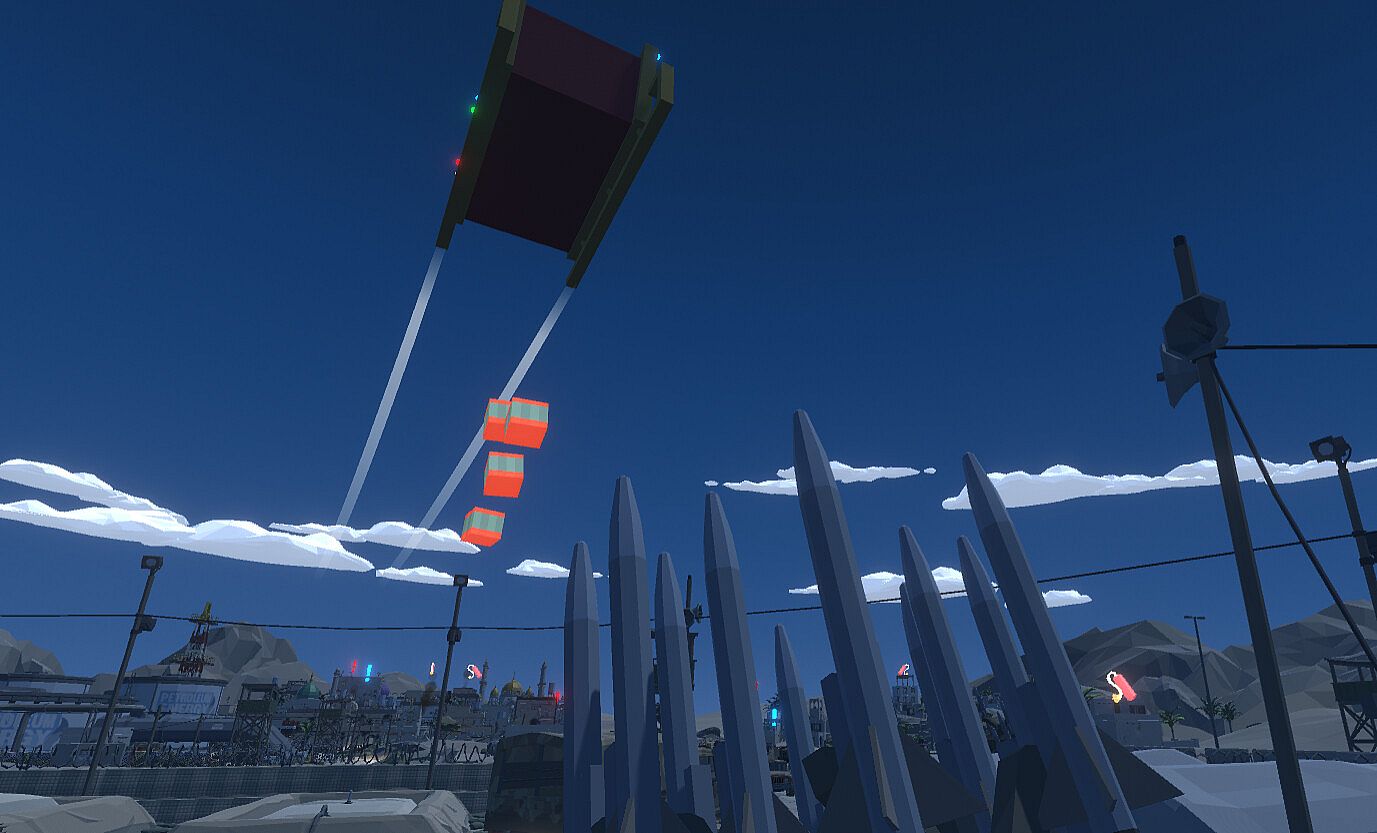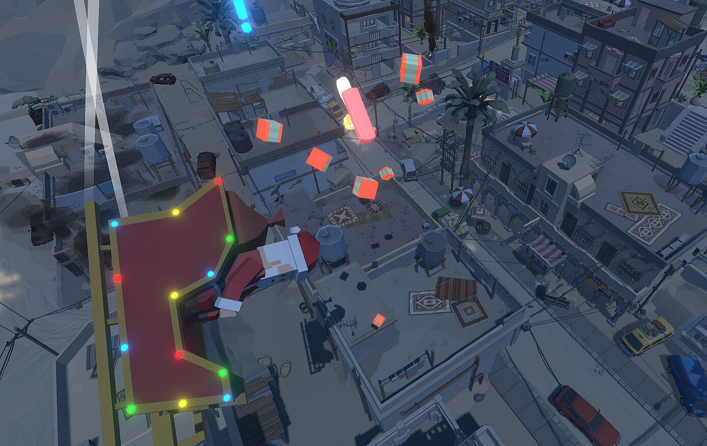 Fly around as Santa with a mouse-based flying controller in an infinite procedurally generated world, delivering presents to children on the Nice List, giving coal to those on the Naughty List, and delivering Christmas cheer to those on the Hit List. Each household is specially marked for easy recognition of what they should receive: a blue exclamation mark for those who have been nice, a red exclamation mark for those who have been naughty, and a stick of dynamite for those who need some extra Christmas cheer! Avoid rockets fired from missile launchers dotted around the map that are trying to keep you from giving Christmas spirit!