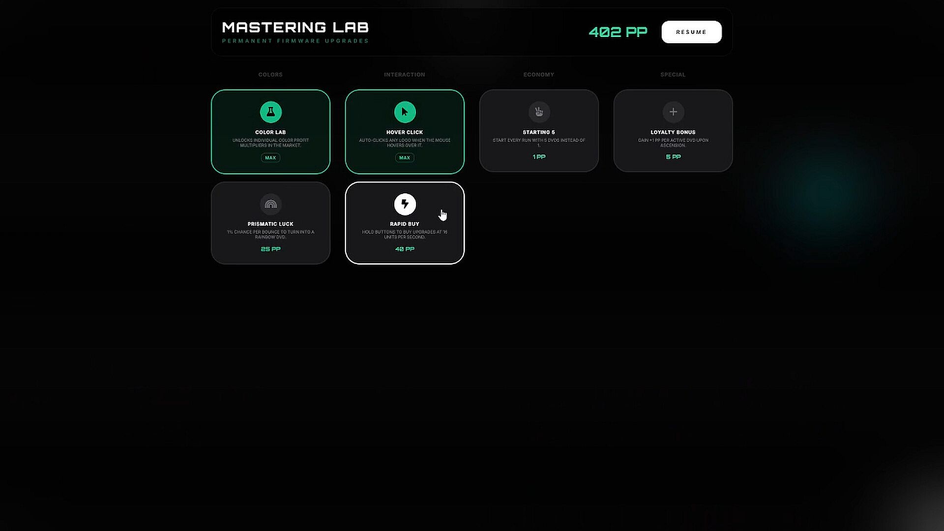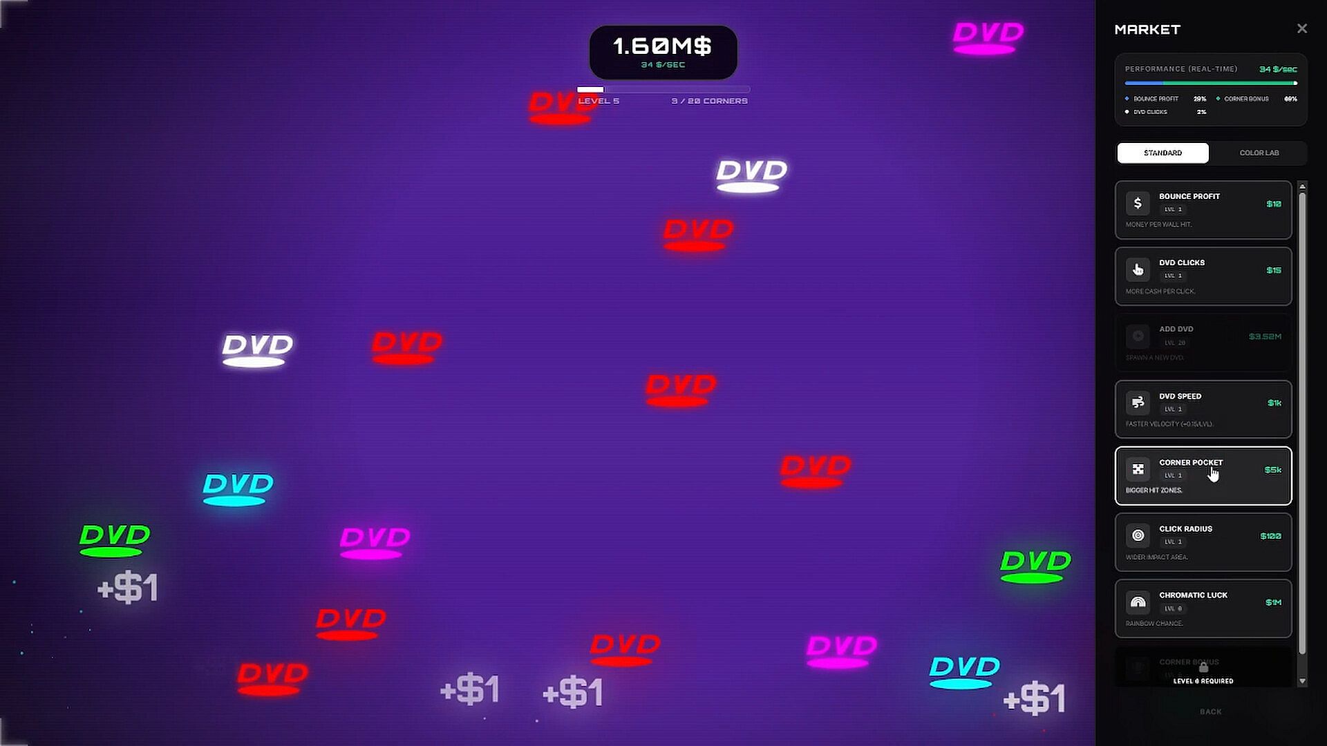 In this minimalist idle game, you watch DVD logos bounce around the screen and generate money with every impact. Use your earnings to upgrade your screen, increase speed, the number of logos, and multipliers, and gradually turn your display into an increasingly profitable visual chaos. The game focuses on infinite progression, optimization, and a relaxing, hypnotic experience.