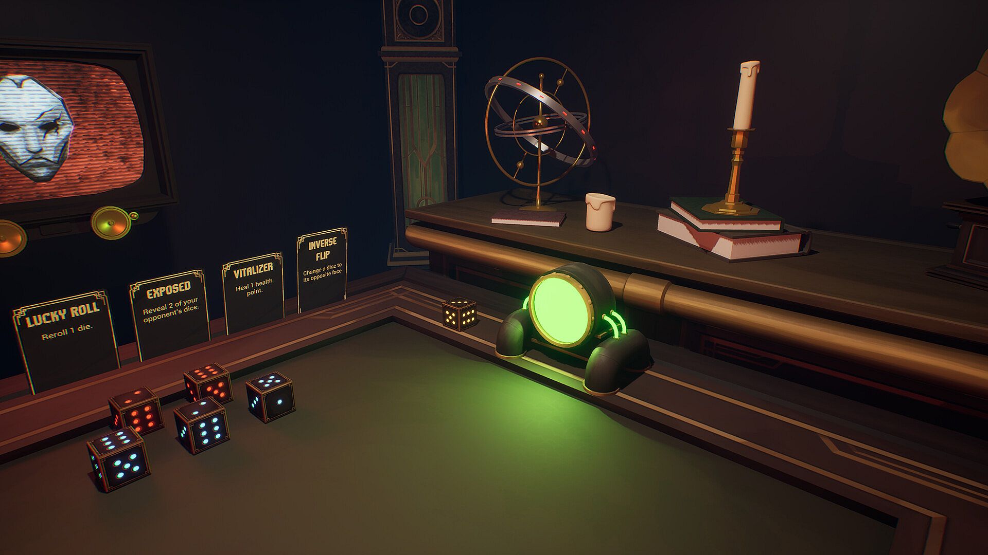 Dice: Each player rolls 5 dice to form hands based on modified Poker rules, including Flush.