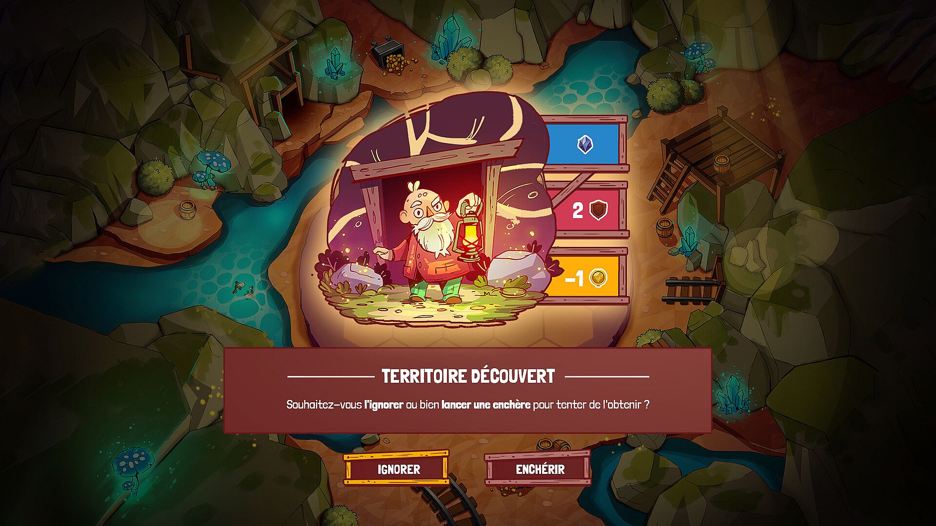Players explore the mine, seeking the most profitable territories. Each new tile discovered sparks an auction: bluff, bid, or back down… If subtlety isn’t your style, challenge opponents head-on and snatch territories in confrontations!