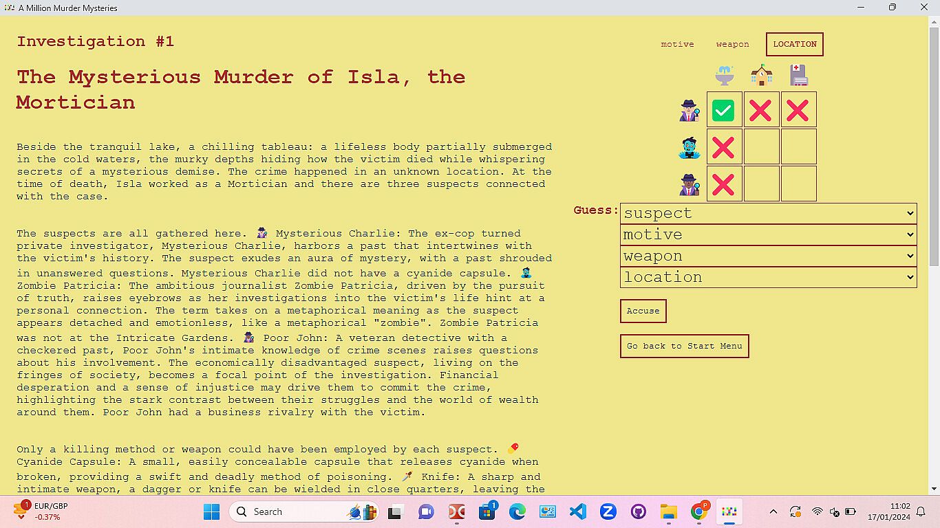 In A Million Murder Mysteries players find themselves in the role of a seasoned detective tasked with solving a diverse range of cases, each with its own unique narrative and set of challenges. The catch? The clock is ticking, and you must sift through a vast sea of text to piece together clues, interrogate suspects, and ultimately identify the perpetrator before it's too late.