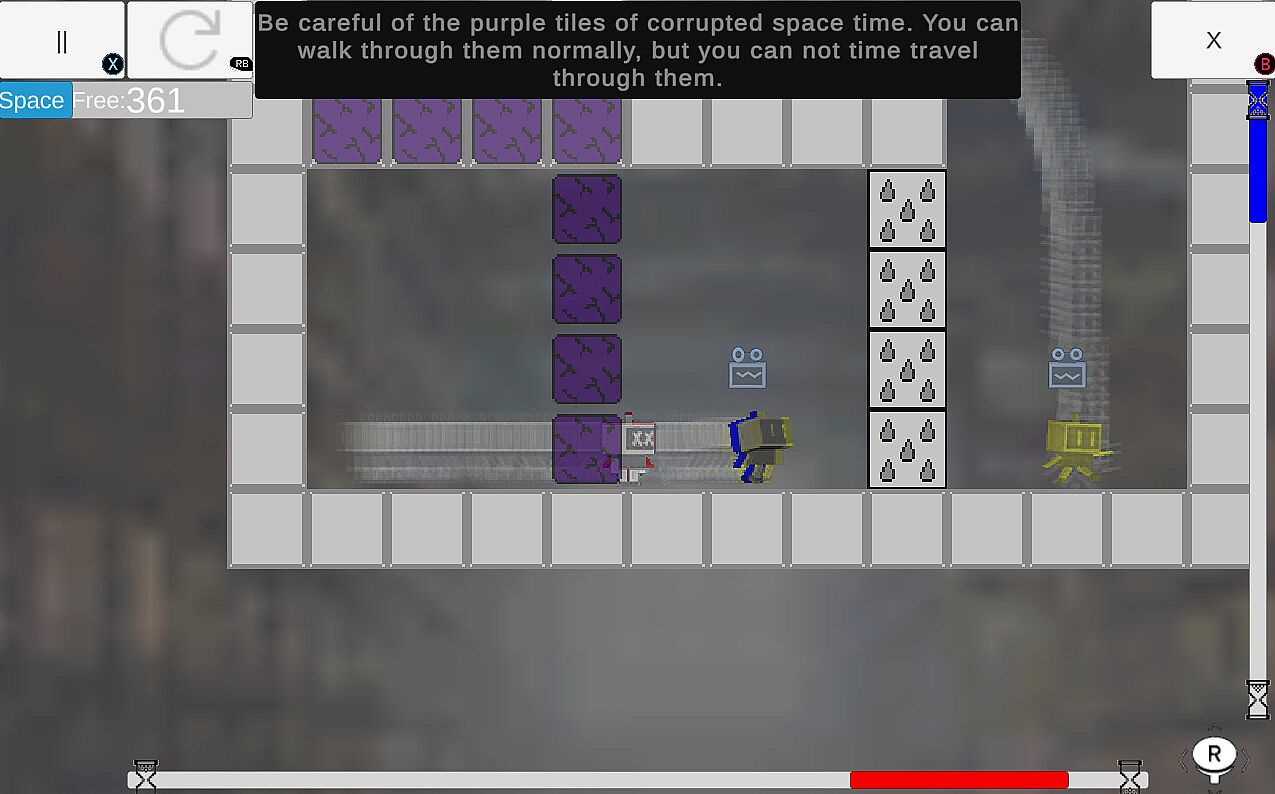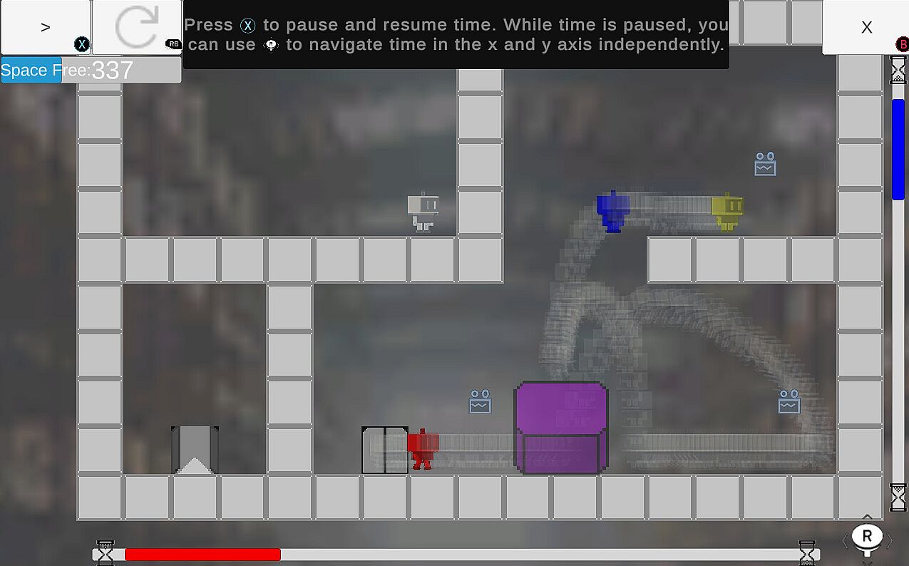 Play as a robot with time-manipulating abilities. Travel to places you’ve never been by independently shifting back in time along the X and Y axes. But beware of pockets of corrupted space-time, and remember, tracking your positions through time consumes significant memory—without it, you won’t be able to function.