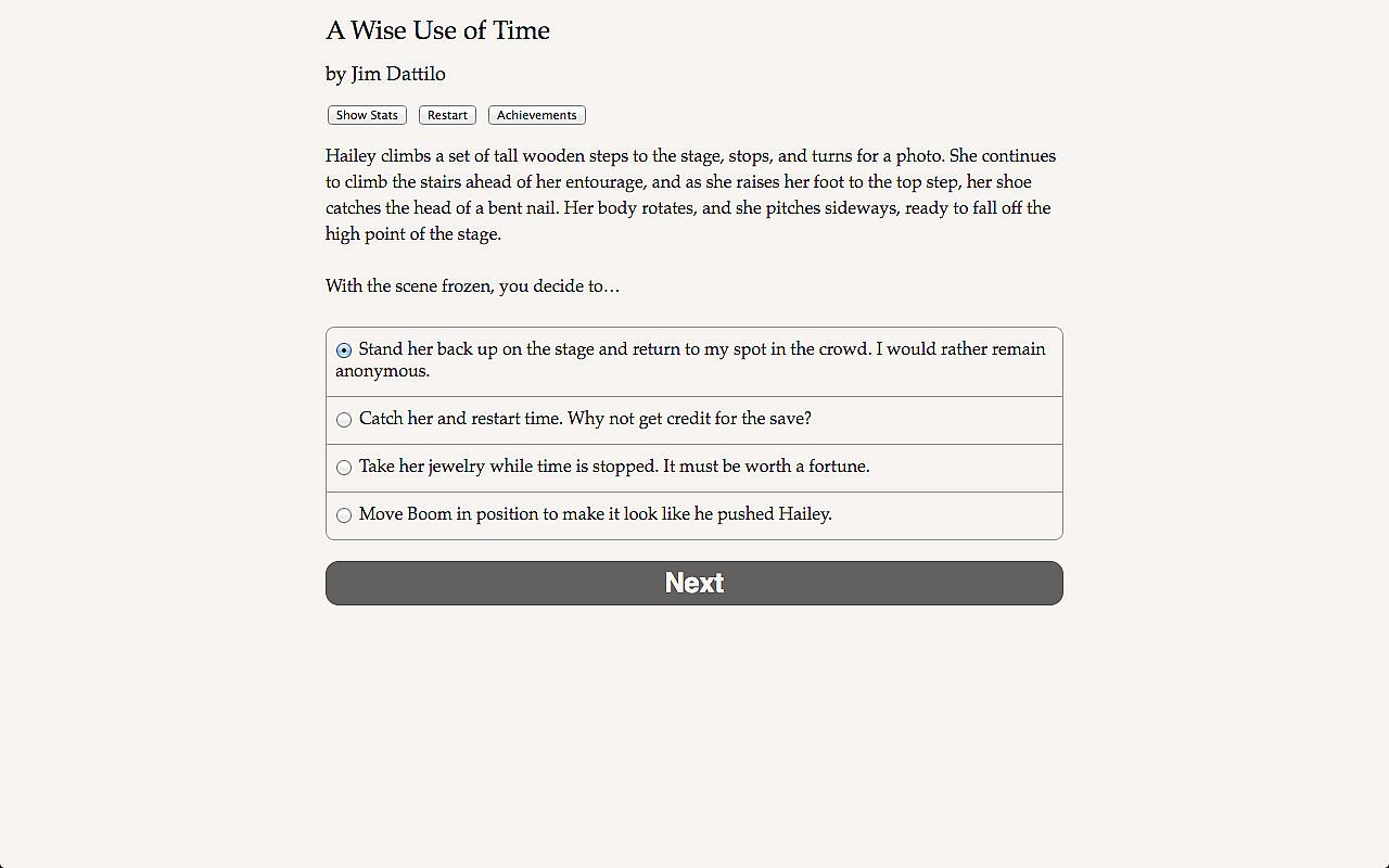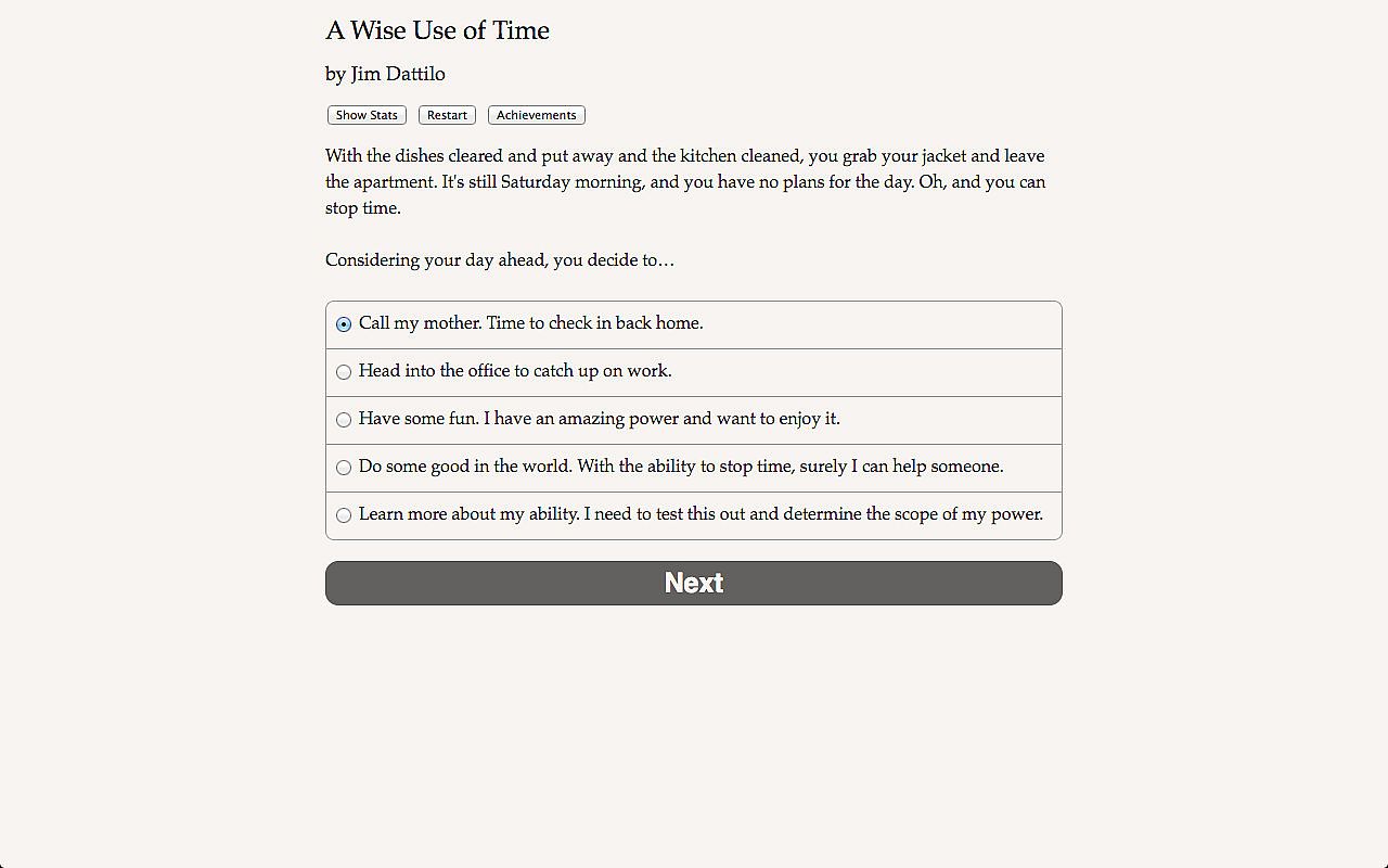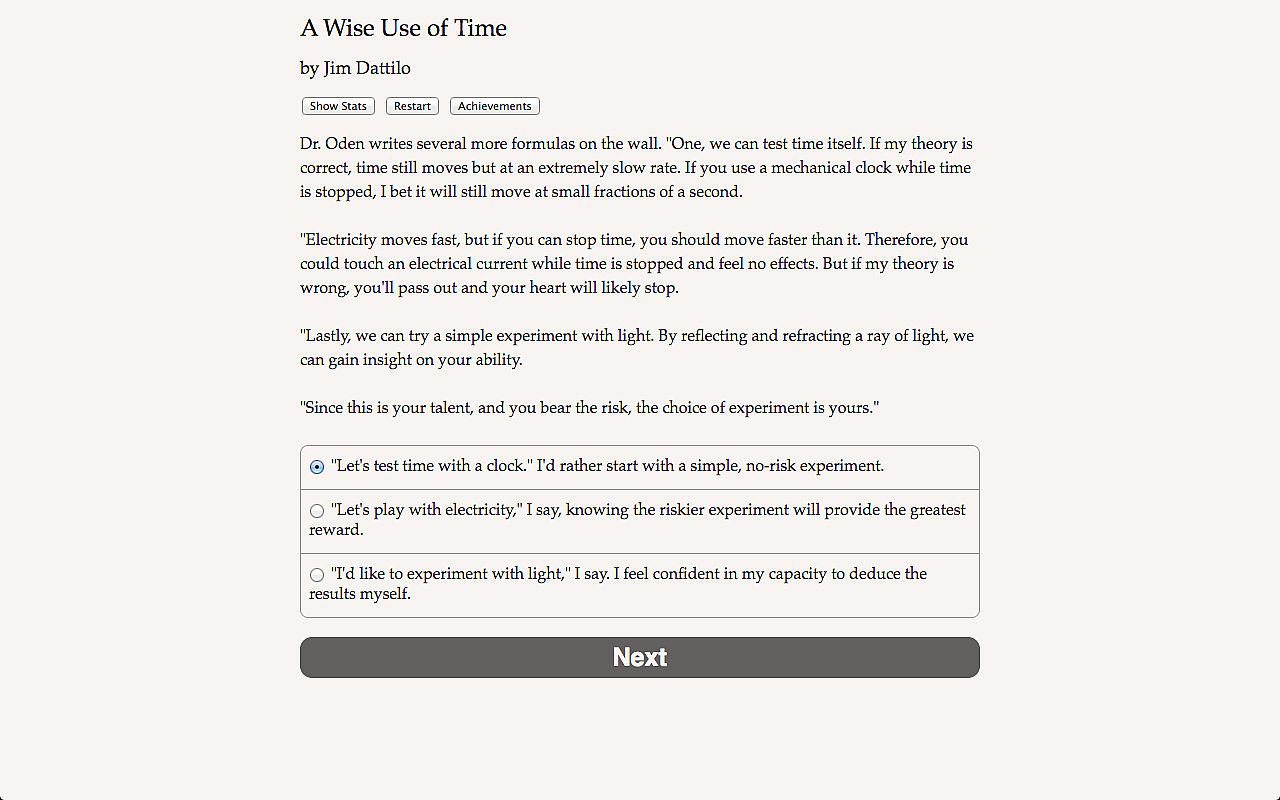 "A Wise Use of Time" is a thrilling 260,000-word interactive sci-fi novel by Jim Dattilo, author of "Zombie Exodus," winner of the 2011 XYZZY "Special Recognition" award for interactive fiction. Your choices control the story. It's entirely text-based--without graphics or sound effects--and fueled by the vast, unstoppable power of your imagination.