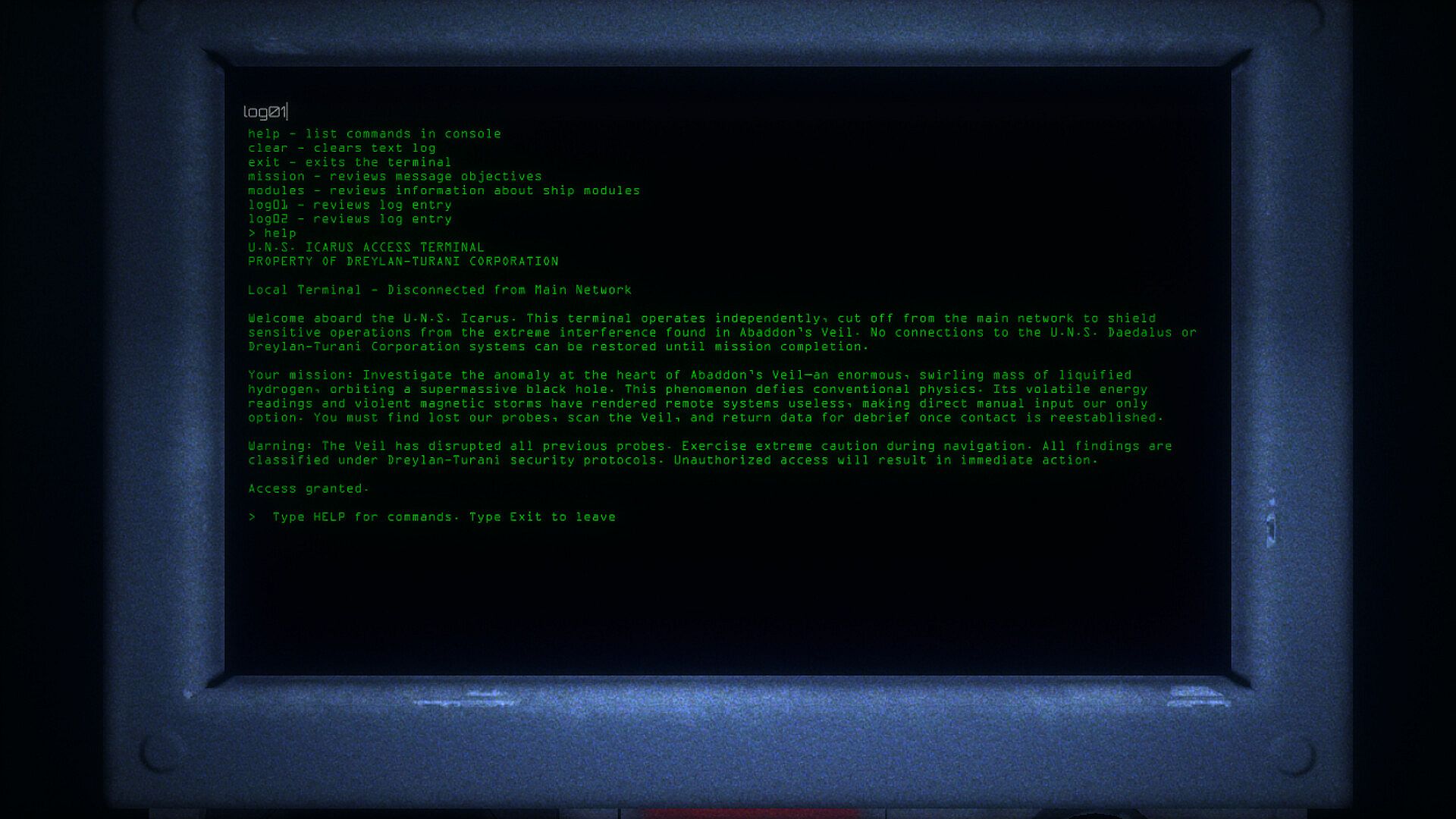 Years ago, sensors discovered quite the anomaly. A swirling mass of liquid hydrogen surrounds a supermassive black hole. Heat and EM readings indicated the body were off the charts. You are manning the U.N.S. Icarus, a scout ship hosted by the carrier, U.N.S. Daedalus. Localized interference patterns were causing scanners and probes to malfunction so... the task falls to you. Deploy sensors, scan the area, and get back to the Daedalus.