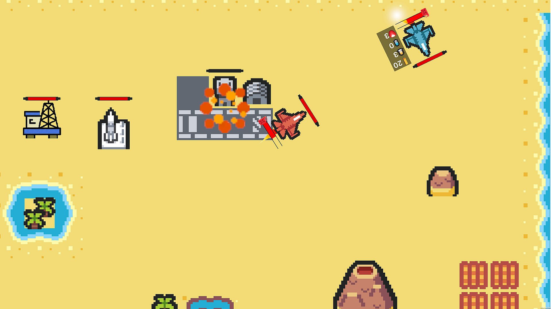 Aces Over Airfields is an intense 2D aerial combat game where you take control of a powerful fighter jet to engage in thrilling dogfights and strategic battles. Set in a retro pixel art environment, you must protect your base's valuable assets, while destroying the enemy's fighter jet and their critical resources. The goal is simple: dominate the skies and achieve victory either by taking down the enemy or decimating their base.