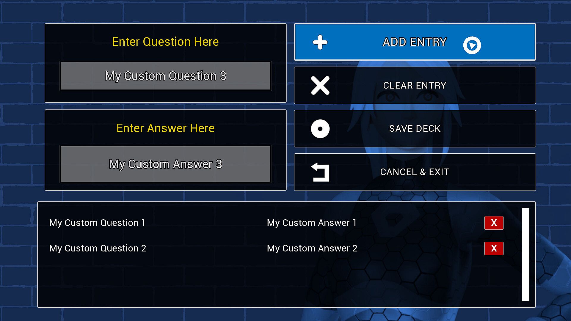 The game allows the user to input text entries, which lets anyone create their own custom sets of study data. Use this study data within the game, and put yourself to the test!