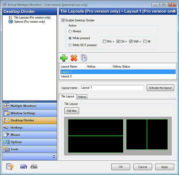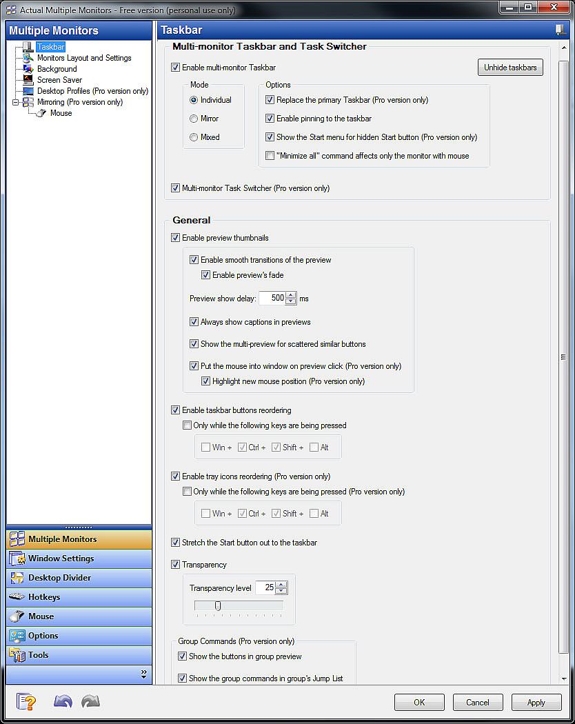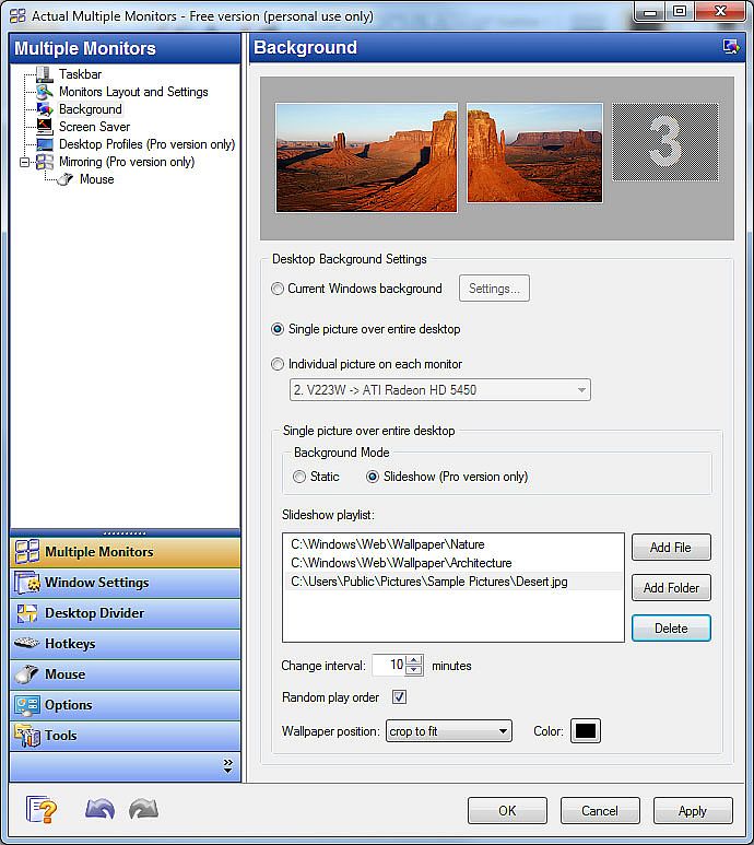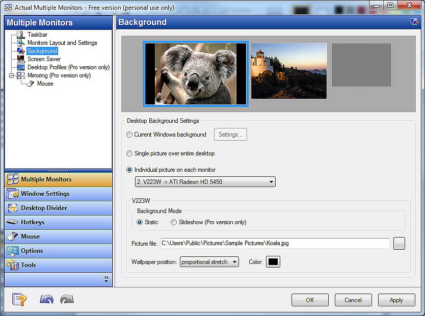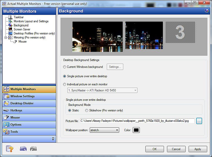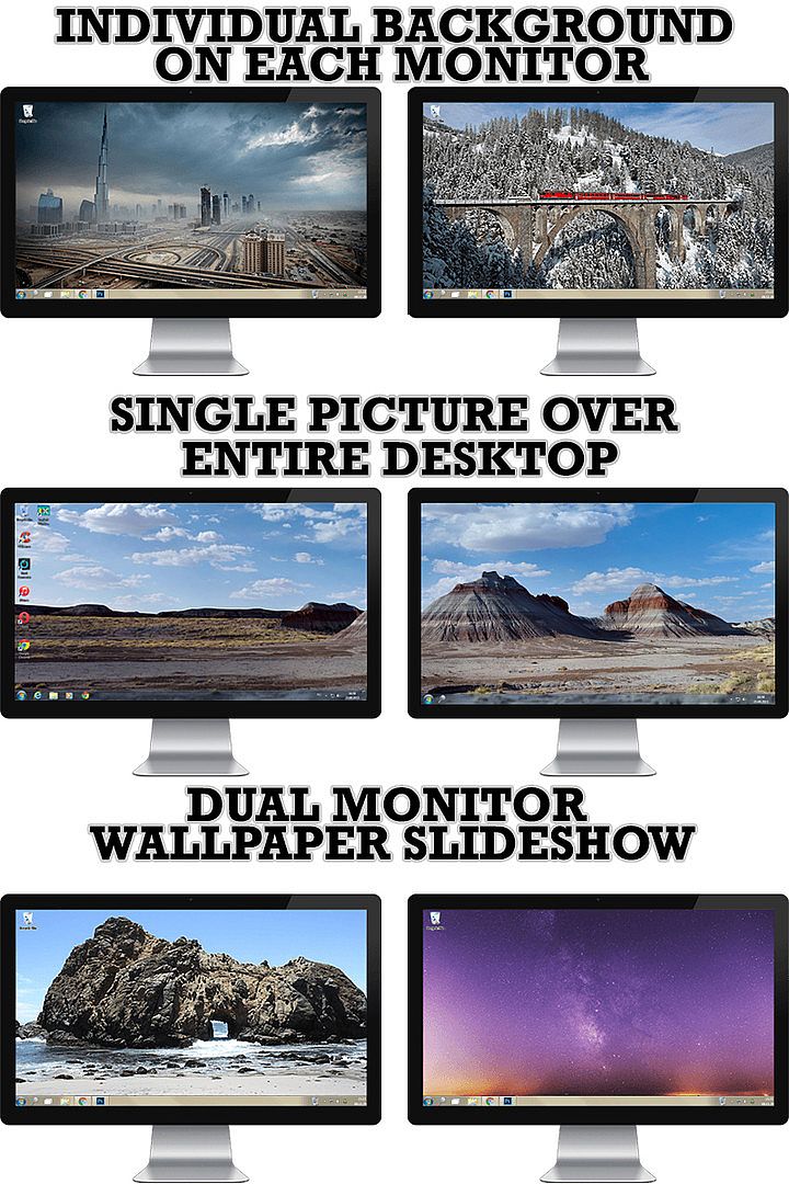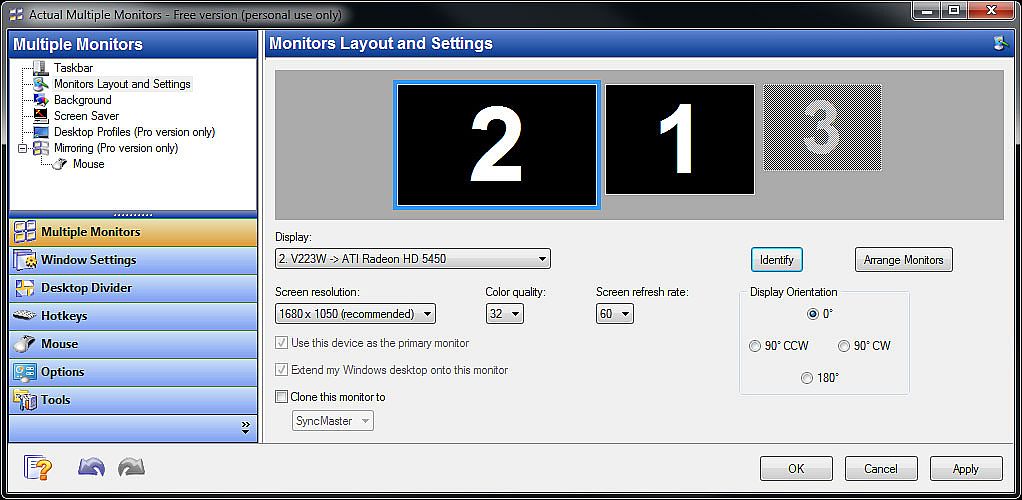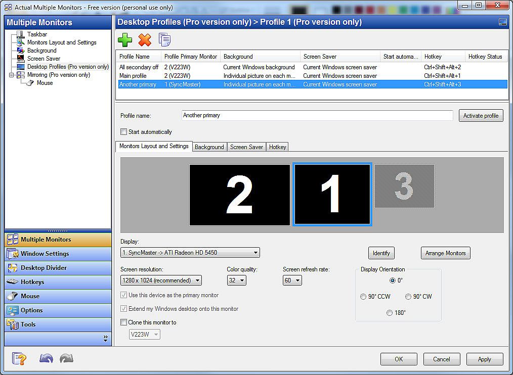 Actual Multiple Monitors fills up the gaps in Windows® user interface when working with several monitors at once. Install Actual Multiple Monitors to get such essential controls as Taskbar, Start menu, system tray and Task Switcher on each connected display, quickly allocate windows between monitors (either manually or automatically), improve the look-and-feel of your desktop with the multi-monitor desktop wallpaper and screen saver, create as many desktop profiles as you need.