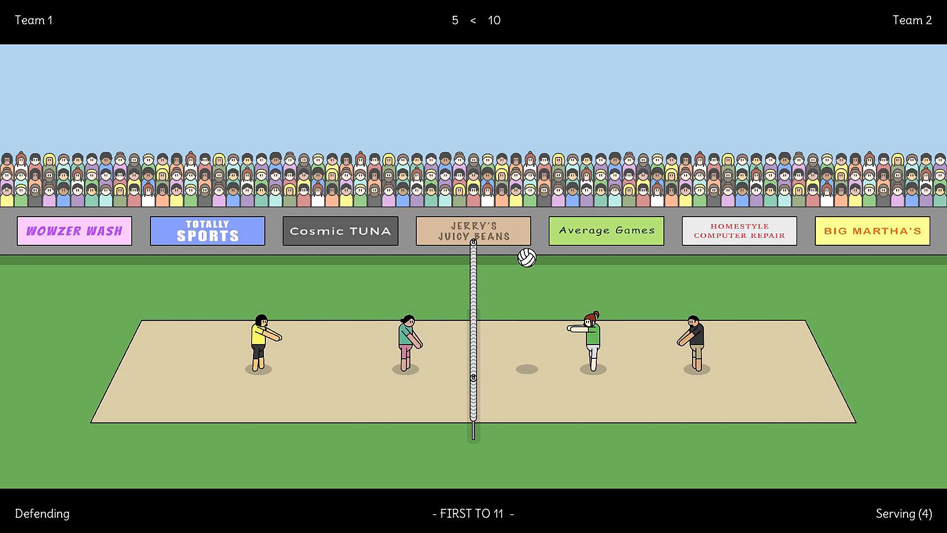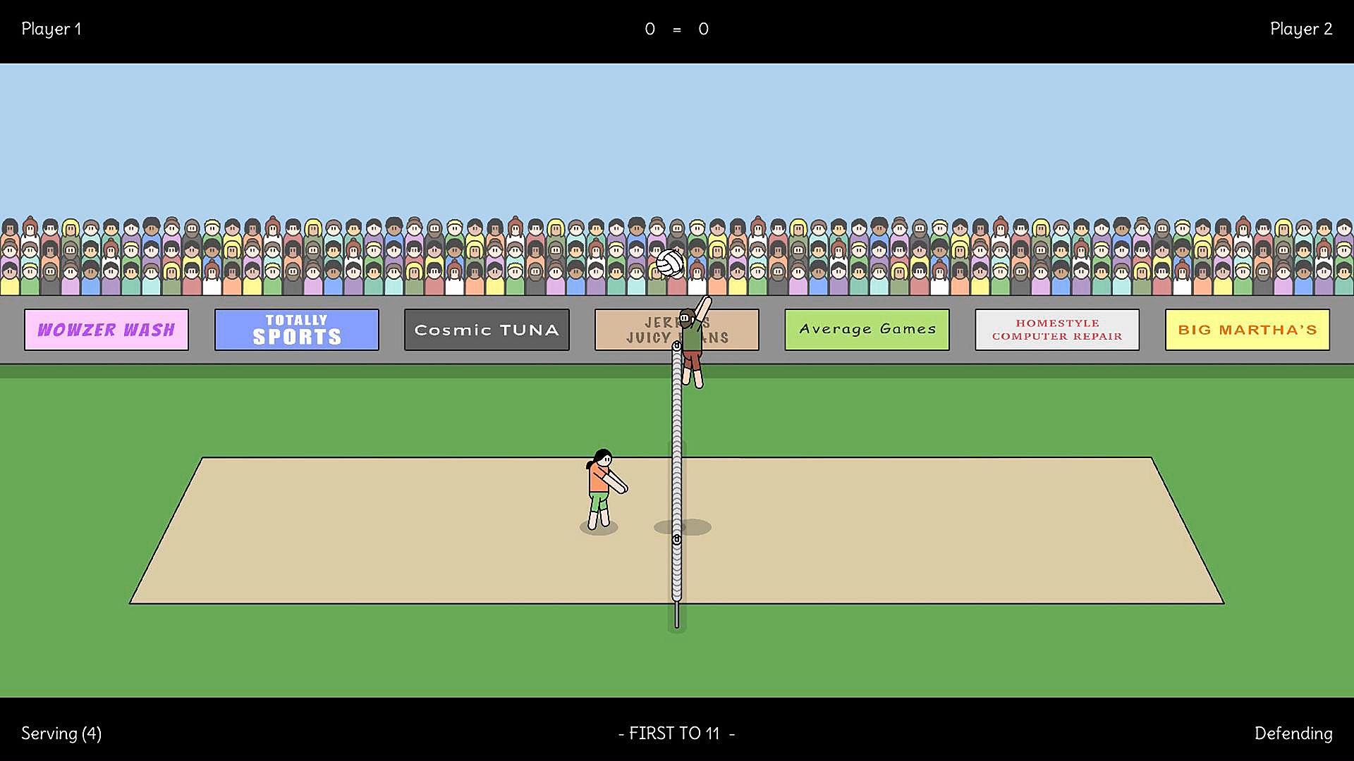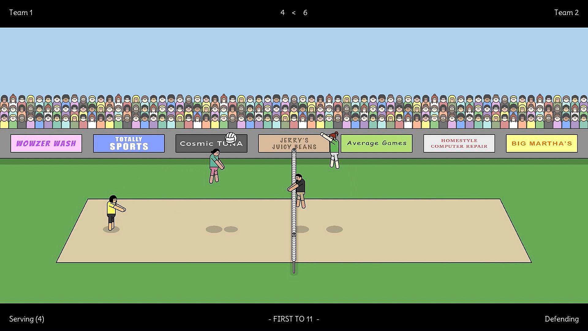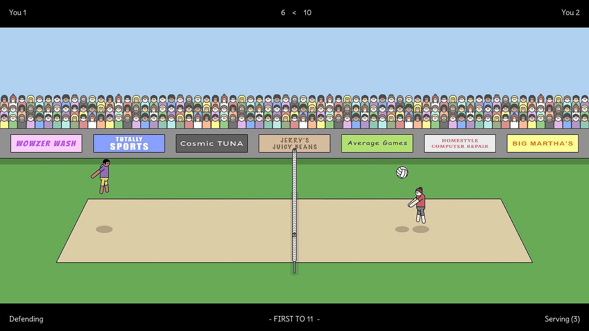 - 2v2 local volleyball action (play in teams).