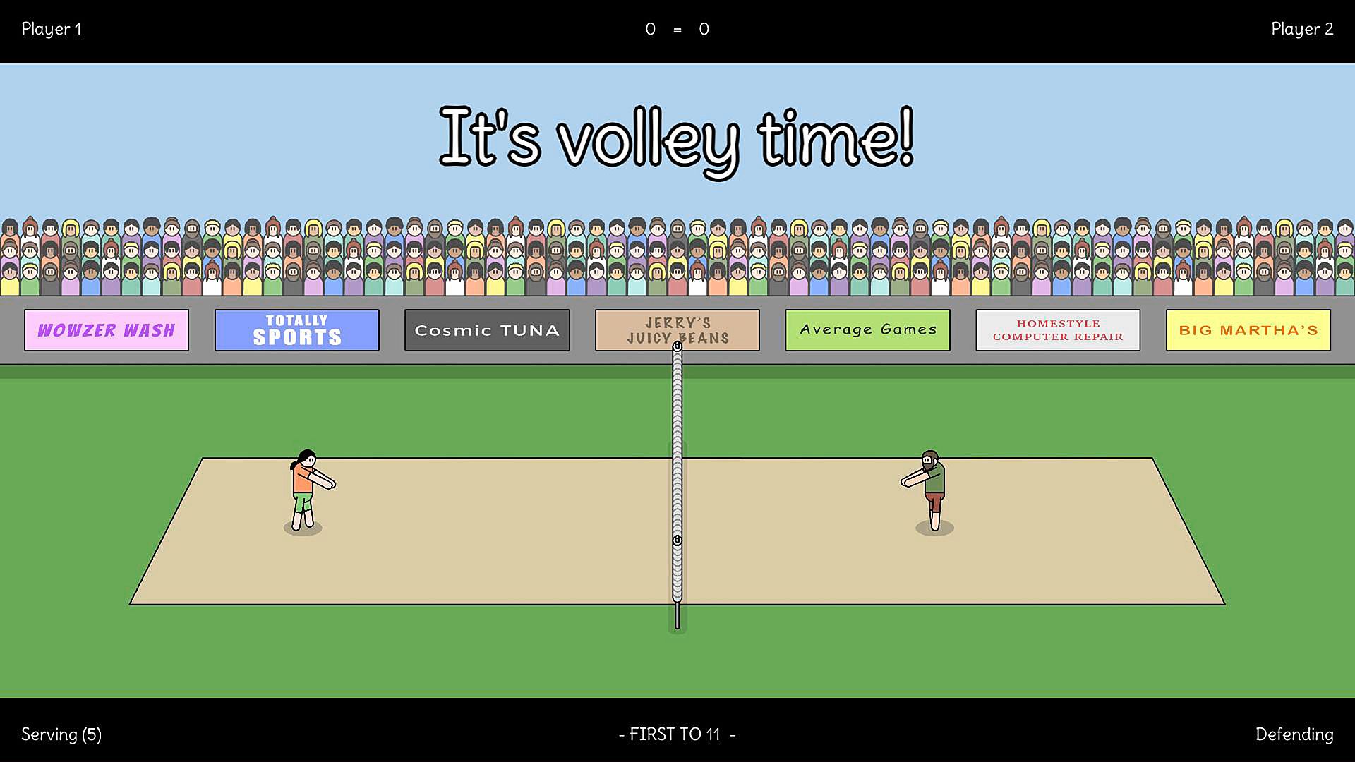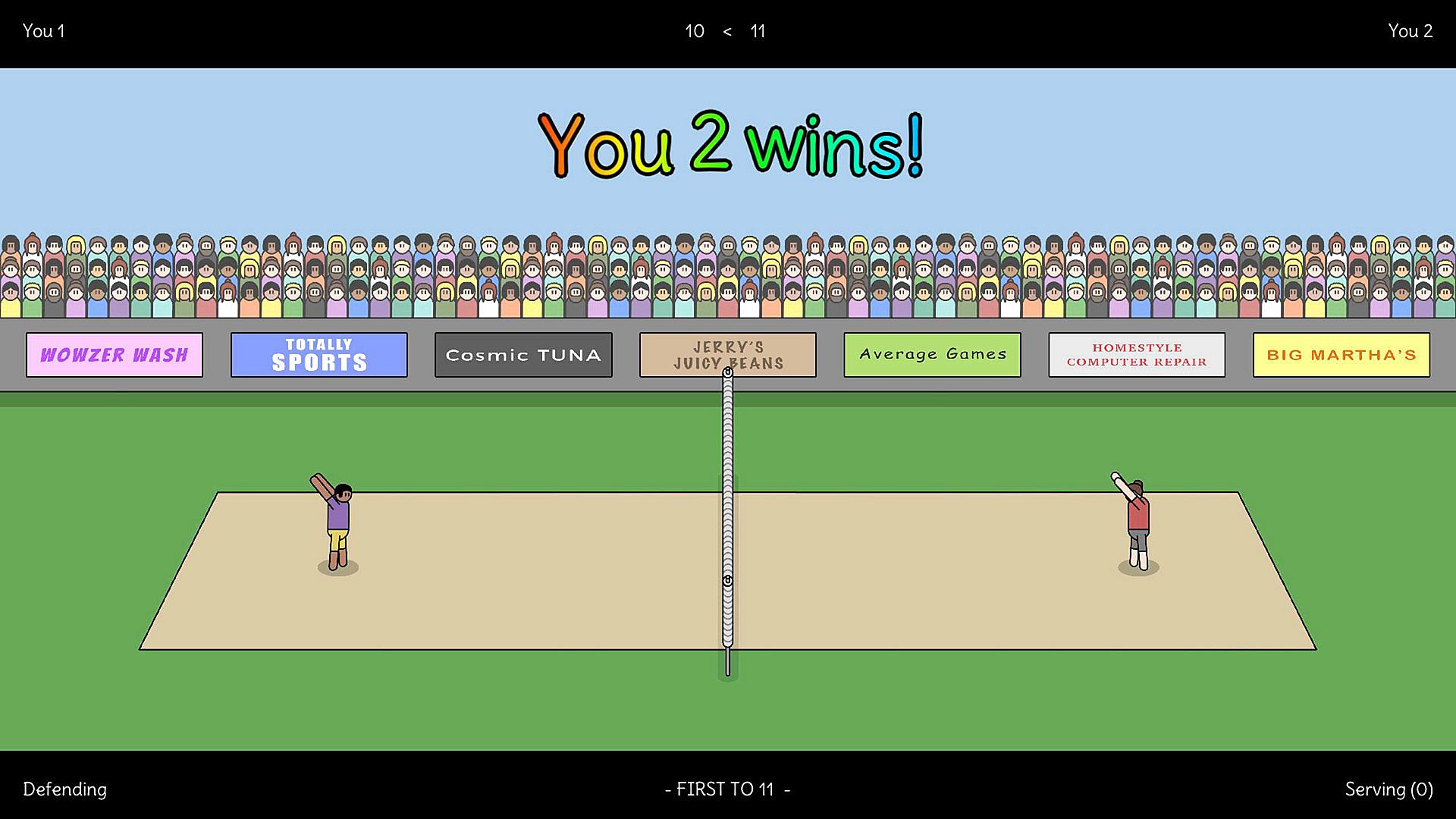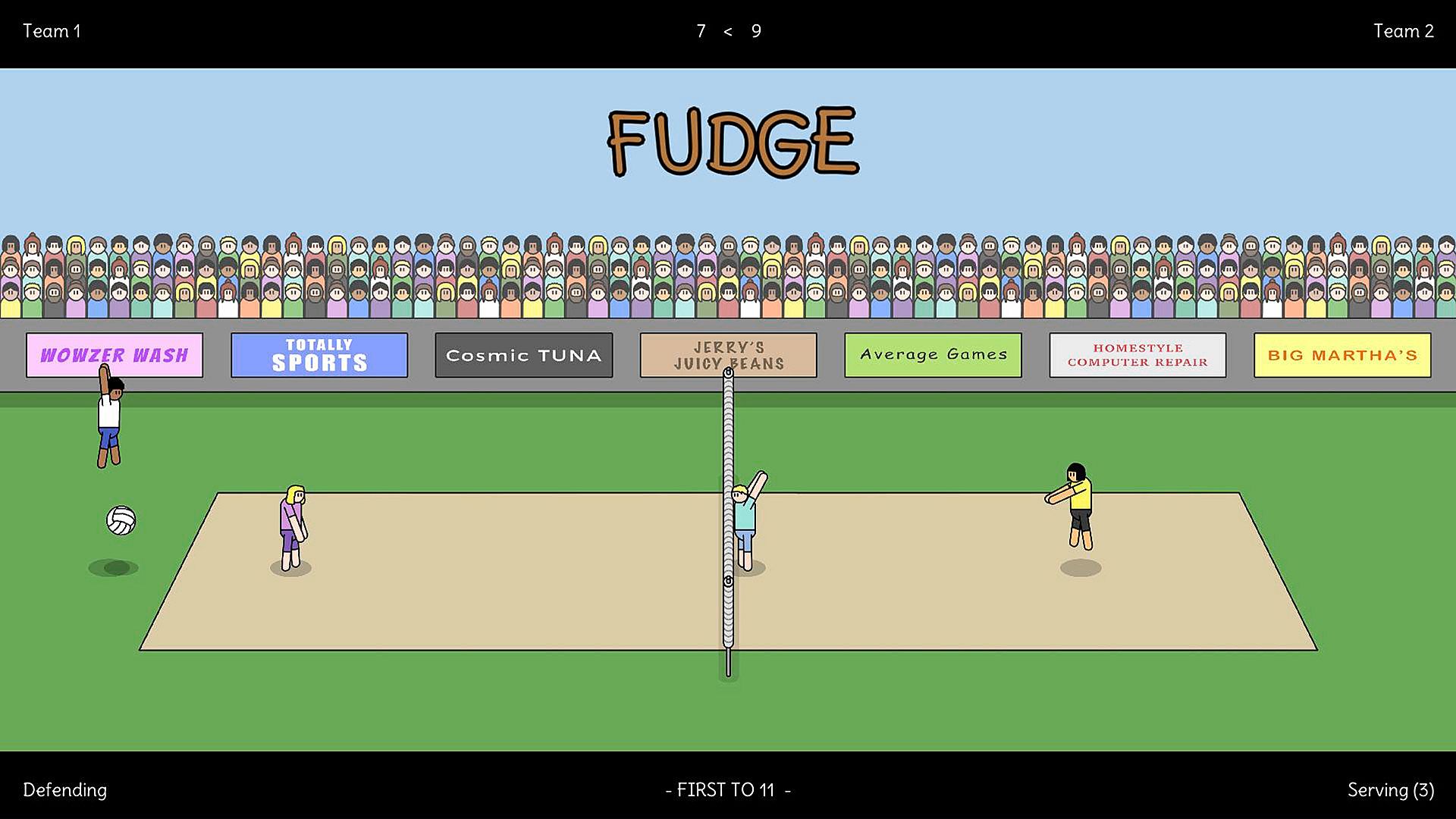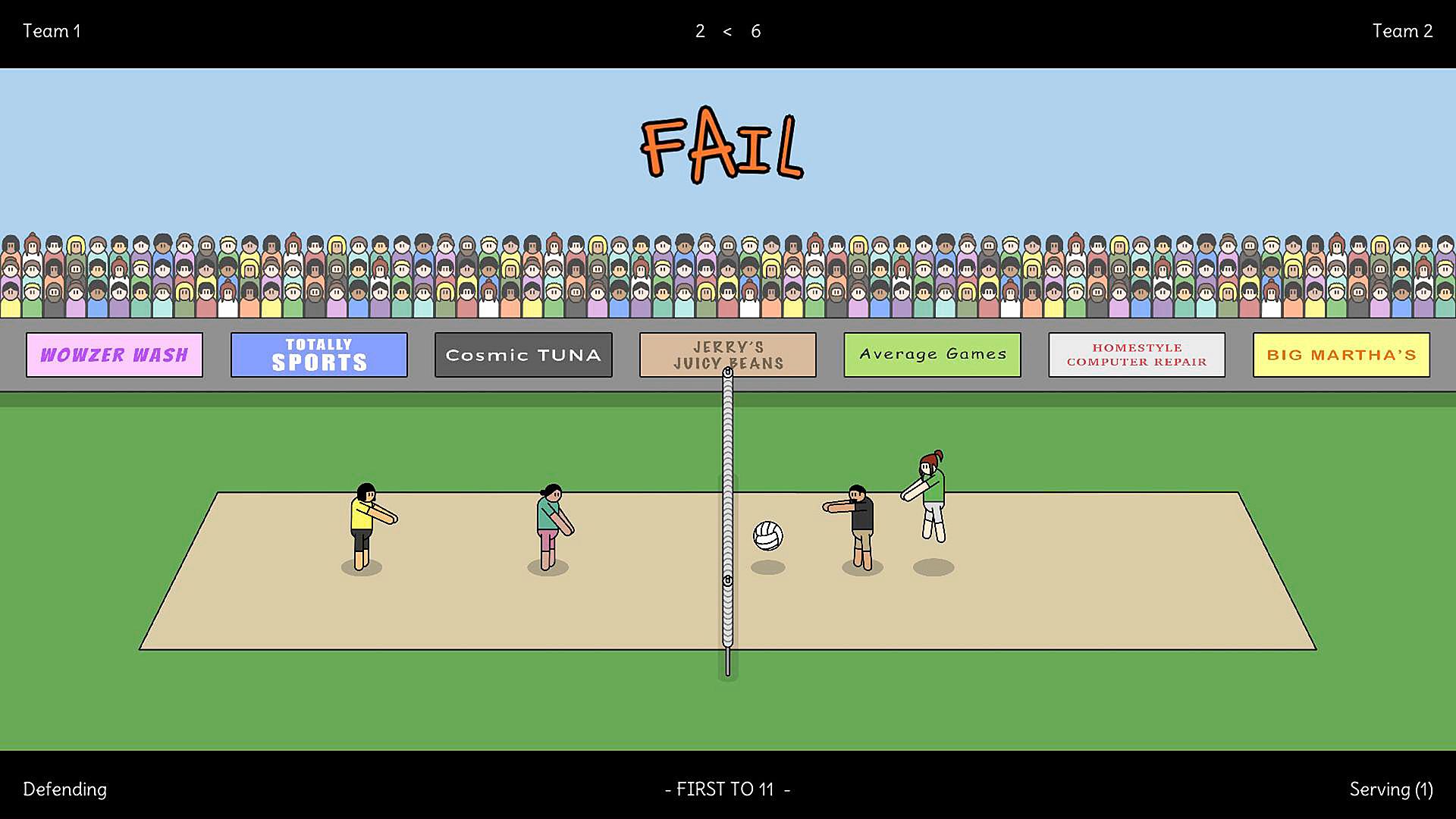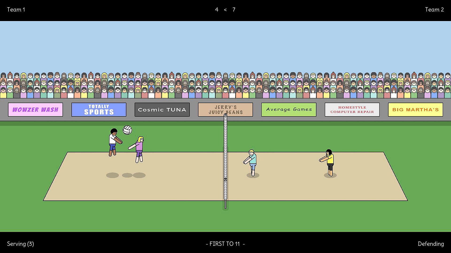 - 2v2 local volleyball action (play in teams).
