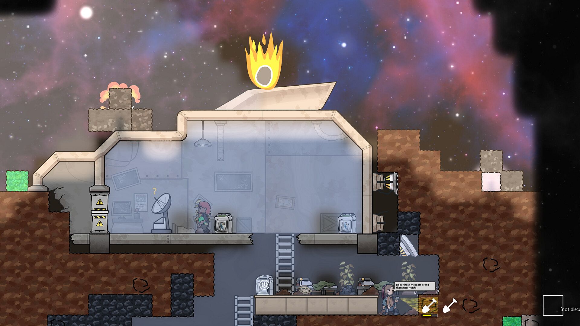 The crashed ship provides shelter and will keep your crew alive for a time. But to survive, you'll have to build a proper base and form a resilient community capable of facing any dangers. Your crew needs somewhere to sleep, eat, wash, heal, and hang out to keep morale up. Manage temperature, connections, plumbing - and that’s just the beginning. Complexity grows over time. Eventually, you’ll have to automate the base, because while it grows, and so does your list of tasks, your crew size does not.
