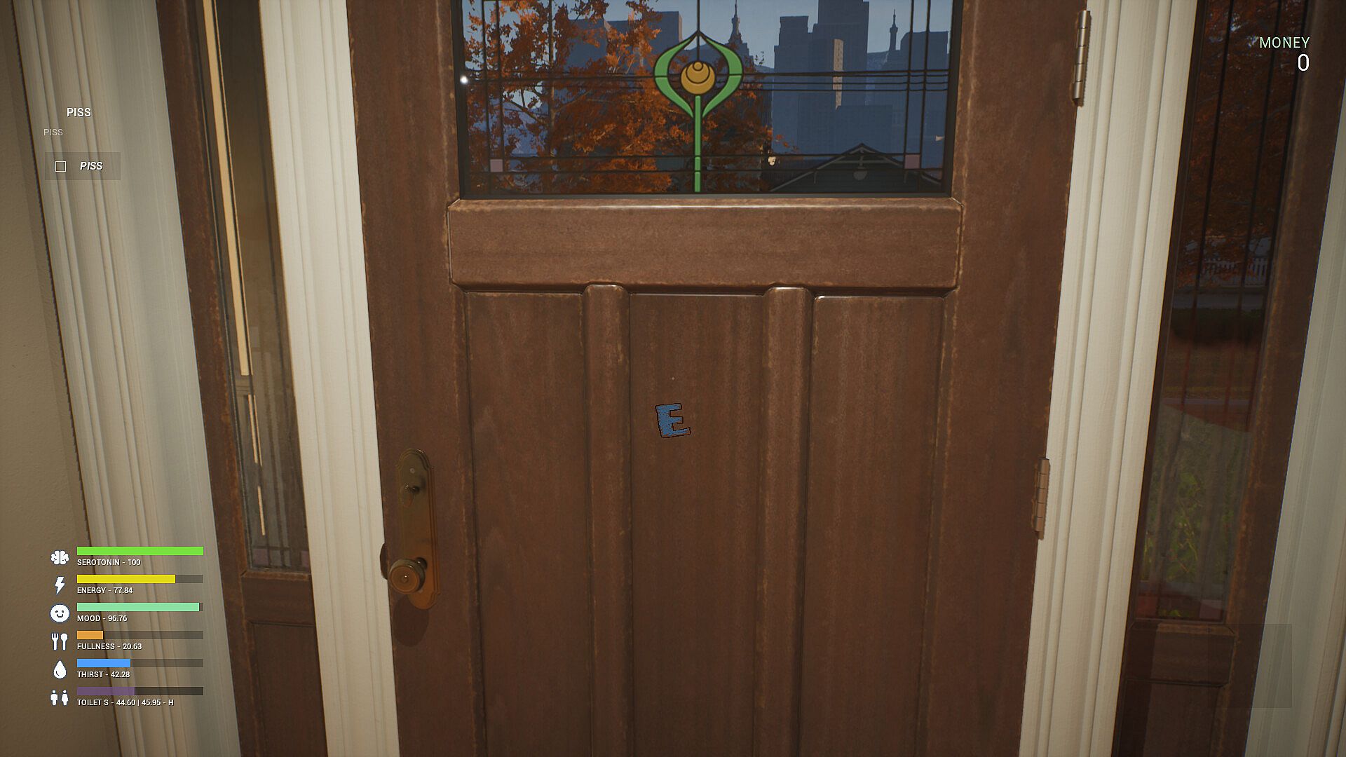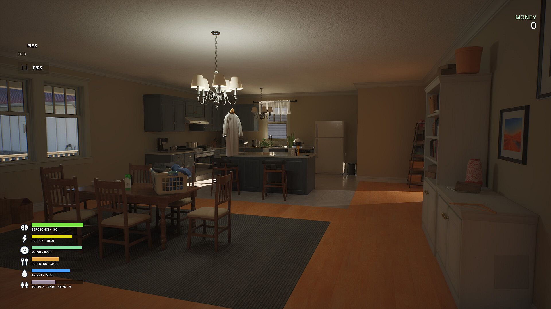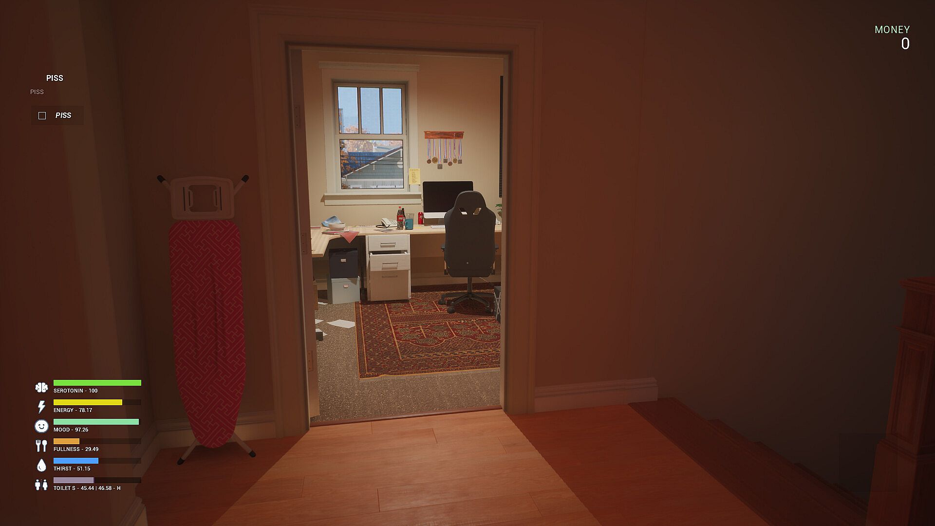• Monitor your stats like focus, serotonin, mood, hunger, thirst, energy, and bladder needs.
