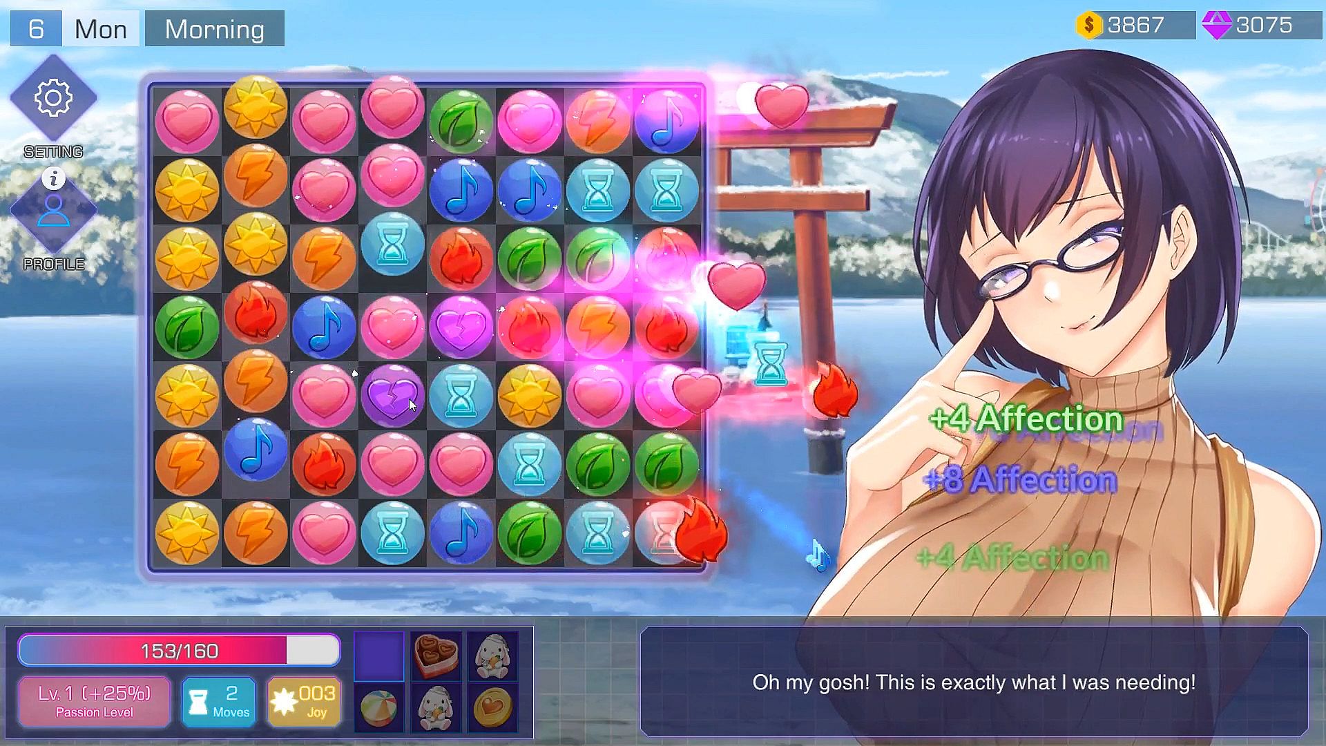 - HuniePop-like match 3 puzzle game with indirect matching mechanic (freely to move token in column and row)