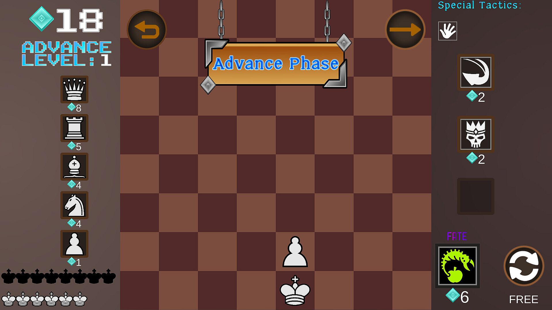 The core of Advancing Chess revolves around assembling and refining your chessboard across multiple sessions. You begin each run with just a king and a pawn, where standard chess rules like pawns advancing extra on the first move, en passant, promotion, and castling are not available at the outset. Instead, you acquire these as special tactics during gameplay, along with entirely new ones that change how pieces move or interact. For example, tactics can introduce improved variants that add layers to existing abilities, encouraging experimentation with unique strategies.