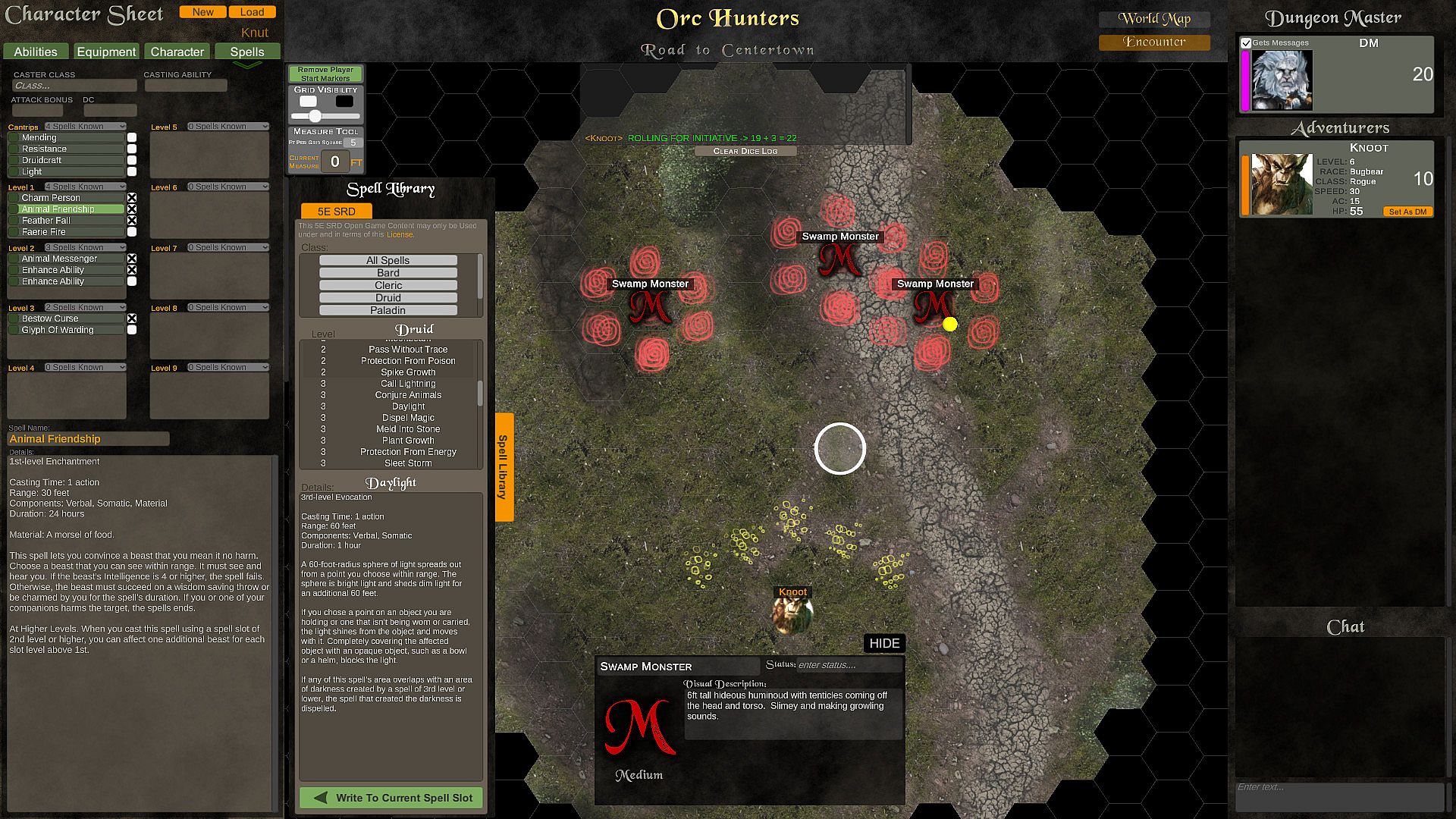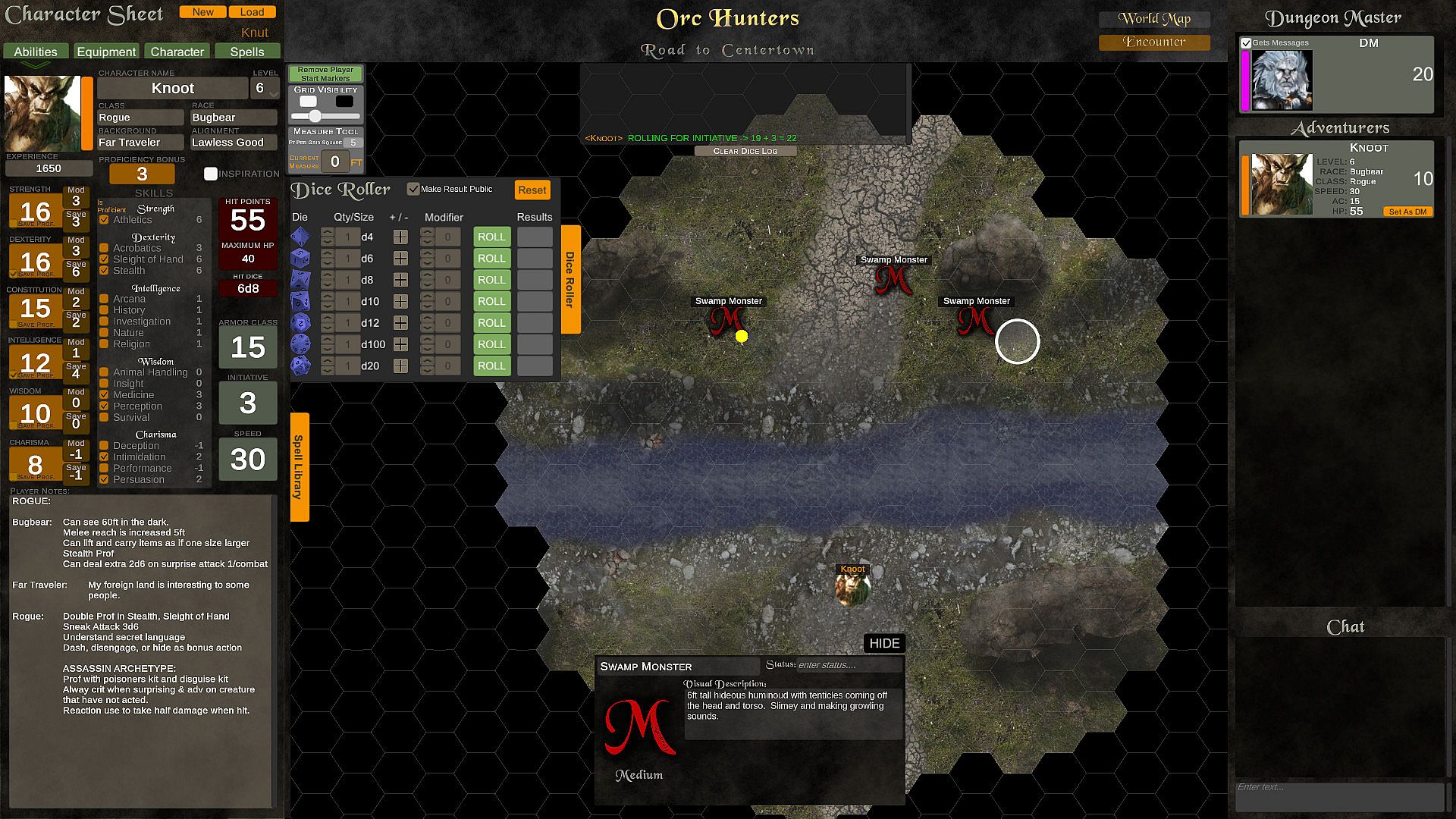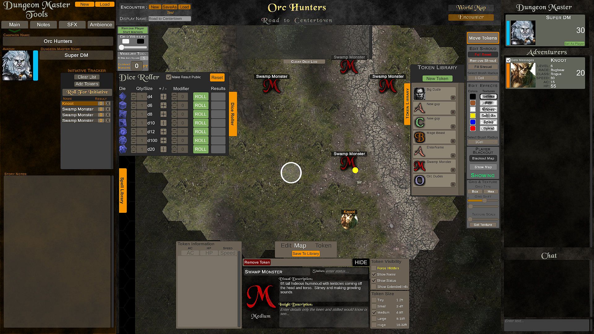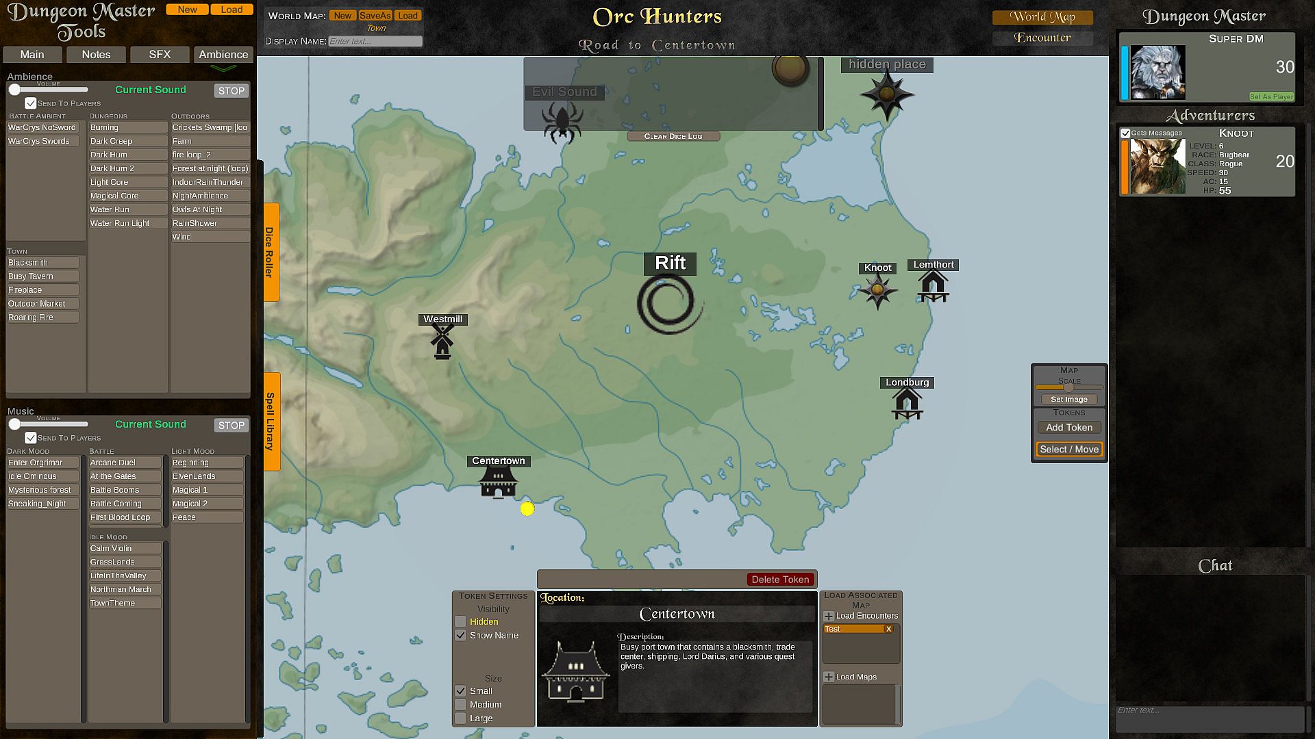 Adventure Portal features player and gm profiles that hold stats and campaign information, an encounter/world map where players and DMs can place custom tokens -- each with their own information sheets, sizes, names, images, and a sound and music board for storytelling enrichment.
