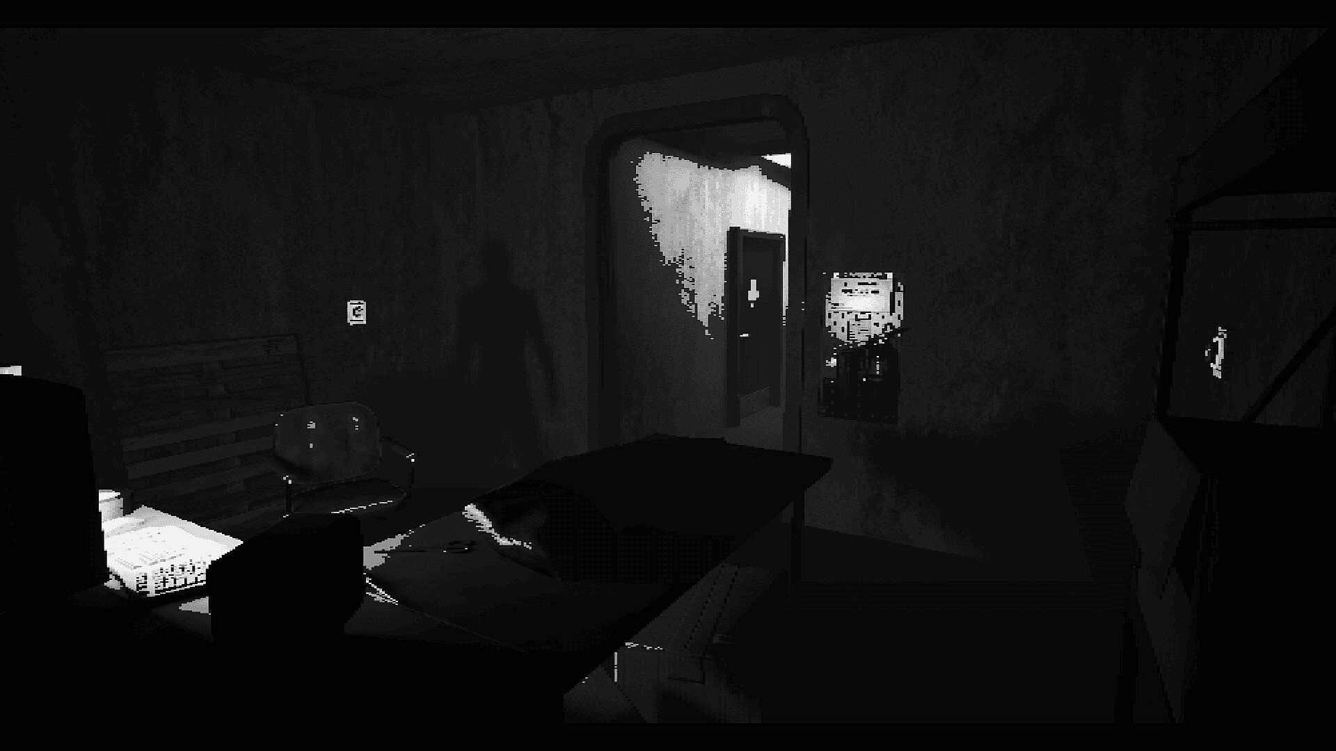 The environment is presented in a retro styled black and white aesthetic reminiscent of early surveillance systems and abandoned office archives. Cold lights, silent rooms and minimal furnishing create an atmosphere where even stillness feels hostile.