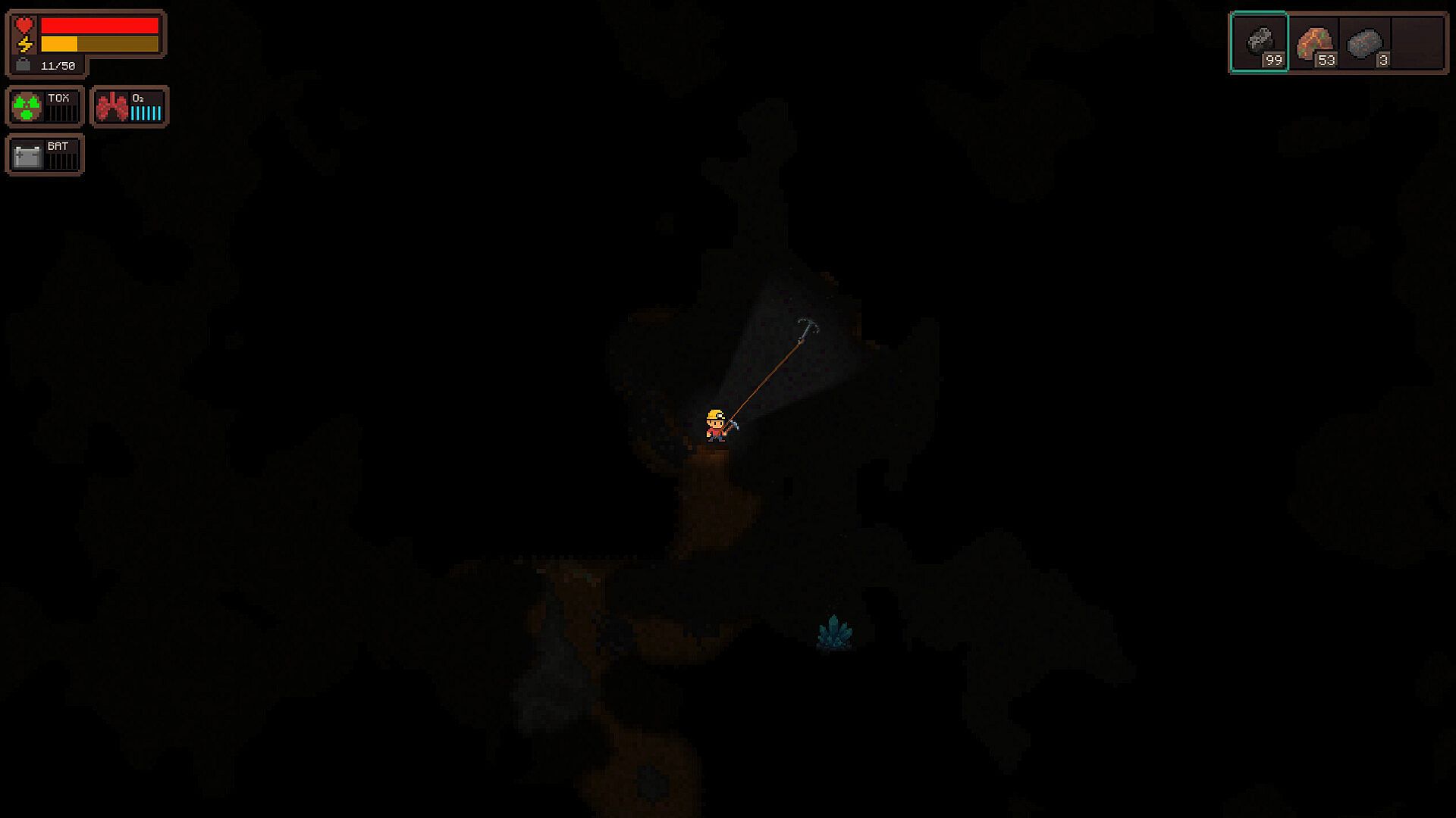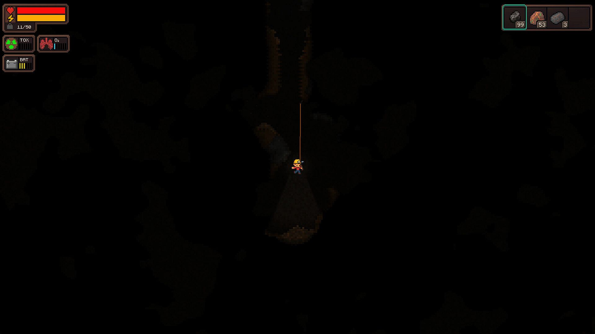 Explore procedurally generated tunnels, swing across vertical shafts with your grappling hook, gather resources, build underground shelters, and keep your base breathing—literally.