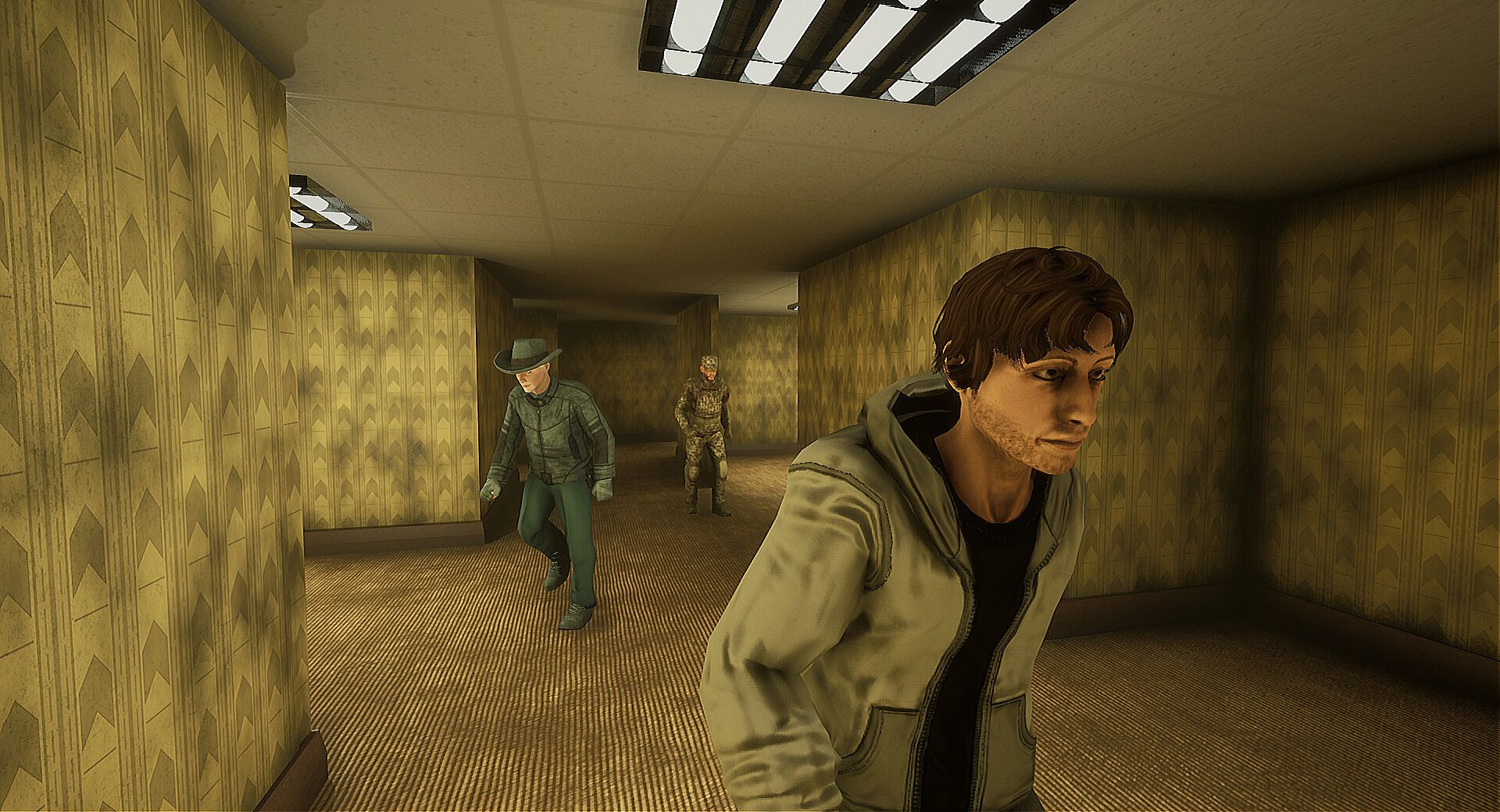 Explore the wonders of these famous liminal spaces as you try and make your way through the different levels, as well as surviving the hostile entities and environments that await you. You'll have to run, hide, fight back, and above all : keep track of your surroundings, it would be a shame if you found yourself separated from your group...