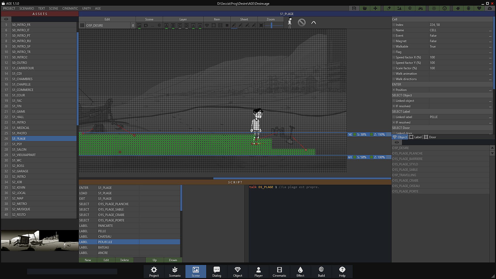 One of the strengths of AGE 1.2 lies in its simplicity of defining the character's walking area and associating an action with a behavior. In the majority of cases when the player decides to retrieve an object present in the scenery by clicking on it, the character must first move towards this object and possibly play the appropriate animation to pick up the object. This sequence of steps is achievable without writing a single line of code using grids and cells.