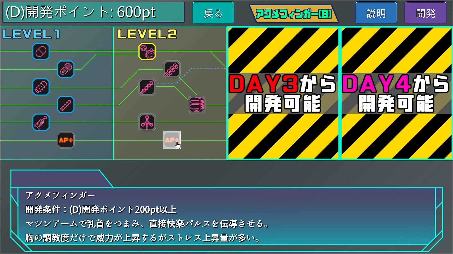 To clear a stage, raise the degree of arousal and training, and finally, FINISH and obtain the orgasm level quota within the turn.